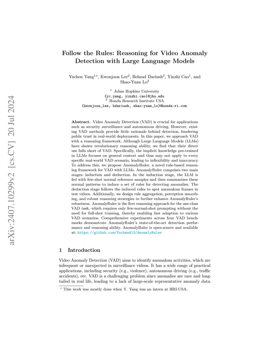 Video Anomaly Detection (VAD) is crucial for applications such as security surveillance and autonomous driving. However, existing VAD methods provide little rationale behind detection, hindering public trust in real-world deployments. In this paper, we approach VAD with a reasoning framework. Although Large Language Models (LLMs) have shown revolutionary reasoning ability, we find that their direct use falls short of VAD. Specifically, the implicit knowledge pre-trained in LLMs focuses on general context and thus may not apply to every specific real-world VAD scenario, leading to inflexibility and inaccuracy. To address this, we propose AnomalyRuler, a novel rule-based reasoning framework for VAD with LLMs. AnomalyRuler comprises two main stages: induction and deduction. In the induction stage, the LLM is fed with few-shot normal reference samples and then summarizes these normal patterns to induce a set of rules for detecting anomalies. The deduction stage follows the induced rules to spot anomalous frames in test videos. Additionally, we design rule aggregation, perception smoothing, and robust reasoning strategies to further enhance AnomalyRuler's robustness. AnomalyRuler is the first reasoning approach for the one-class VAD task, which requires only few-normal-shot prompting without the need for full-shot training, thereby enabling fast adaption to various VAD scenarios. Comprehensive experiments across four VAD benchmarks demonstrate AnomalyRuler's state-of-the-art detection performance and reasoning ability. AnomalyRuler is open-source and available at: https://github.com/Yuchen413/AnomalyRuler