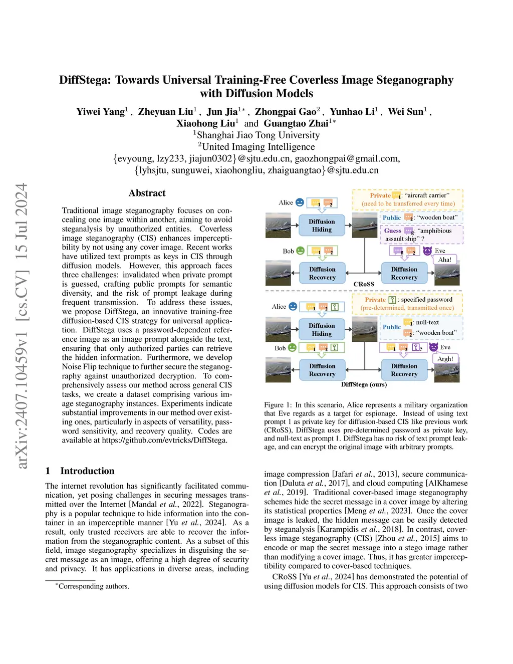 Traditional image steganography focuses on concealing one image within another, aiming to avoid steganalysis by unauthorized entities. Coverless image steganography (CIS) enhances imperceptibility by not using any cover image. Recent works have utilized text prompts as keys in CIS through diffusion models. However, this approach faces three challenges: invalidated when private prompt is guessed, crafting public prompts for semantic diversity, and the risk of prompt leakage during frequent transmission. To address these issues, we propose DiffStega, an innovative training-free diffusion-based CIS strategy for universal application. DiffStega uses a password-dependent reference image as an image prompt alongside the text, ensuring that only authorized parties can retrieve the hidden information. Furthermore, we develop Noise Flip technique to further secure the steganography against unauthorized decryption. To comprehensively assess our method across general CIS tasks, we create a dataset comprising various image steganography instances. Experiments indicate substantial improvements in our method over existing ones, particularly in aspects of versatility, password sensitivity, and recovery quality. Codes are available at \url{https://github.com/evtricks/DiffStega}.