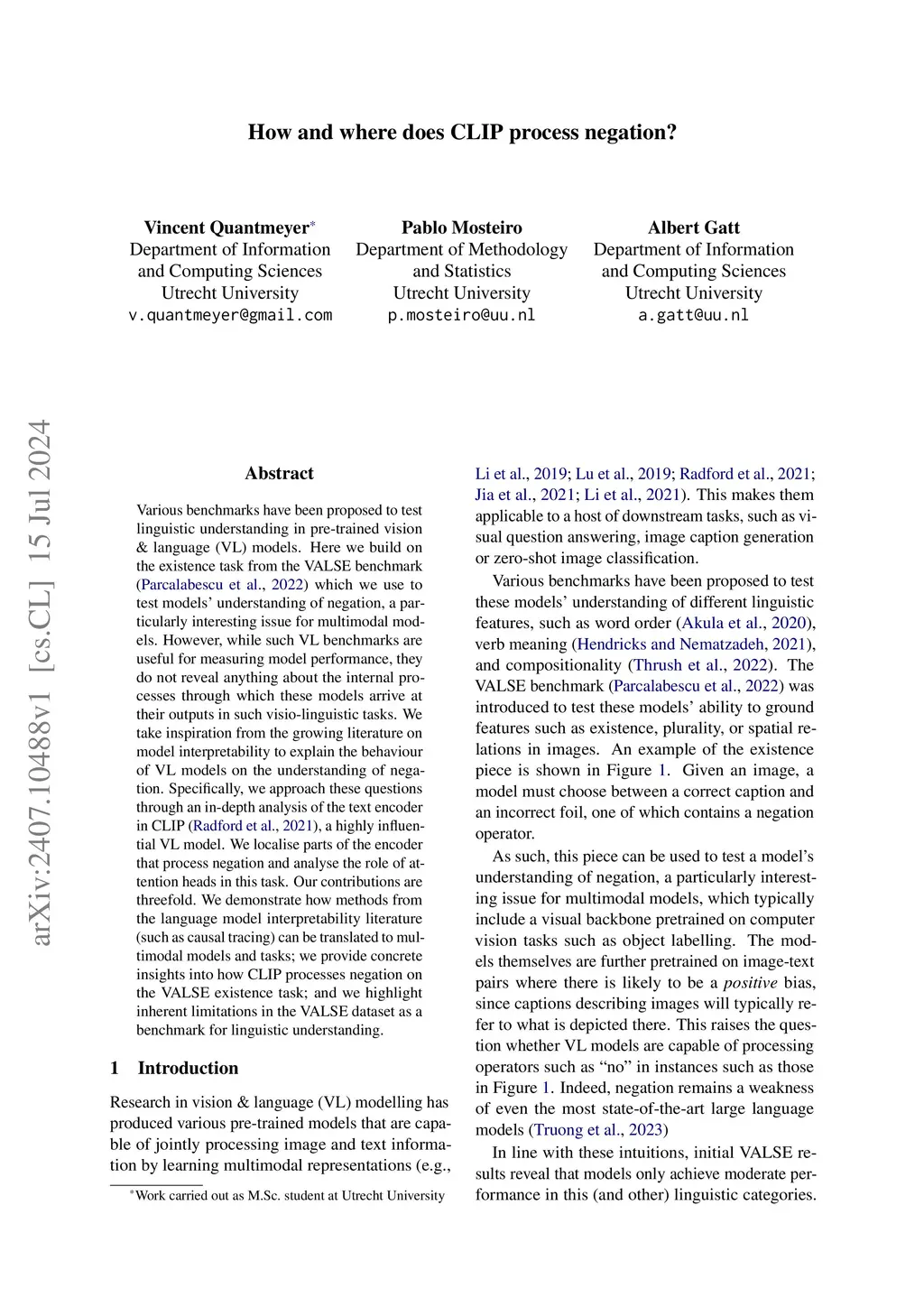 Various benchmarks have been proposed to test linguistic understanding in pre-trained vision \& language (VL) models. Here we build on the existence task from the VALSE benchmark (Parcalabescu et al, 2022) which we use to test models' understanding of negation, a particularly interesting issue for multimodal models. However, while such VL benchmarks are useful for measuring model performance, they do not reveal anything about the internal processes through which these models arrive at their outputs in such visio-linguistic tasks. We take inspiration from the growing literature on model interpretability to explain the behaviour of VL models on the understanding of negation. Specifically, we approach these questions through an in-depth analysis of the text encoder in CLIP (Radford et al, 2021), a highly influential VL model. We localise parts of the encoder that process negation and analyse the role of attention heads in this task. Our contributions are threefold. We demonstrate how methods from the language model interpretability literature (such as causal tracing) can be translated to multimodal models and tasks; we provide concrete insights into how CLIP processes negation on the VALSE existence task; and we highlight inherent limitations in the VALSE dataset as a benchmark for linguistic understanding.