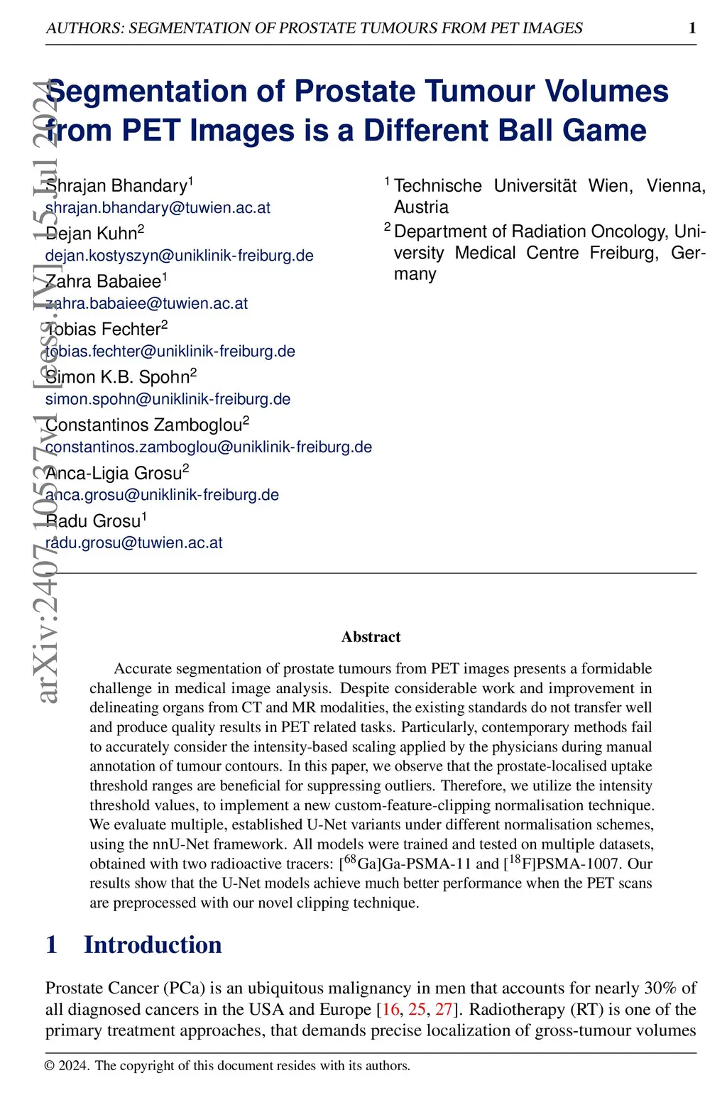 Accurate segmentation of prostate tumours from PET images presents a formidable challenge in medical image analysis. Despite considerable work and improvement in delineating organs from CT and MR modalities, the existing standards do not transfer well and produce quality results in PET related tasks. Particularly, contemporary methods fail to accurately consider the intensity-based scaling applied by the physicians during manual annotation of tumour contours. In this paper, we observe that the prostate-localised uptake threshold ranges are beneficial for suppressing outliers. Therefore, we utilize the intensity threshold values, to implement a new custom-feature-clipping normalisation technique. We evaluate multiple, established U-Net variants under different normalisation schemes, using the nnU-Net framework. All models were trained and tested on multiple datasets, obtained with two radioactive tracers: [68-Ga]Ga-PSMA-11 and [18-F]PSMA-1007. Our results show that the U-Net models achieve much better performance when the PET scans are preprocessed with our novel clipping technique.