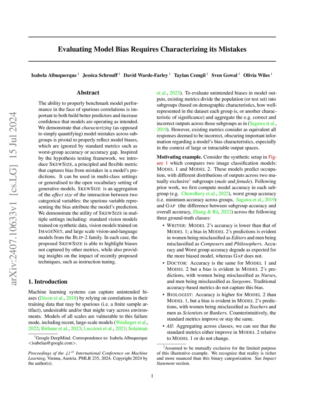The ability to properly benchmark model performance in the face of spurious correlations is important to both build better predictors and increase confidence that models are operating as intended. We demonstrate that characterizing (as opposed to simply quantifying) model mistakes across subgroups is pivotal to properly reflect model biases, which are ignored by standard metrics such as worst-group accuracy or accuracy gap. Inspired by the hypothesis testing framework, we introduce SkewSize, a principled and flexible metric that captures bias from mistakes in a model's predictions. It can be used in multi-class settings or generalised to the open vocabulary setting of generative models. SkewSize is an aggregation of the effect size of the interaction between two categorical variables: the spurious variable representing the bias attribute and the model's prediction. We demonstrate the utility of SkewSize in multiple settings including: standard vision models trained on synthetic data, vision models trained on ImageNet, and large scale vision-and-language models from the BLIP-2 family. In each case, the proposed SkewSize is able to highlight biases not captured by other metrics, while also providing insights on the impact of recently proposed techniques, such as instruction tuning.