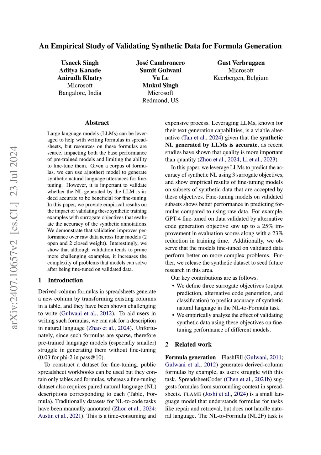 Large language models (LLMs) can be leveraged to help with writing formulas in spreadsheets, but resources on these formulas are scarce, impacting both the base performance of pre-trained models and limiting the ability to fine-tune them. Given a corpus of formulas, we can use a(nother) model to generate synthetic natural language utterances for fine-tuning. However, it is important to validate whether the NL generated by the LLM is indeed accurate to be beneficial for fine-tuning. In this paper, we provide empirical results on the impact of validating these synthetic training examples with surrogate objectives that evaluate the accuracy of the synthetic annotations. We demonstrate that validation improves performance over raw data across four models (2 open and 2 closed weight). Interestingly, we show that although validation tends to prune more challenging examples, it increases the complexity of problems that models can solve after being fine-tuned on validated data.