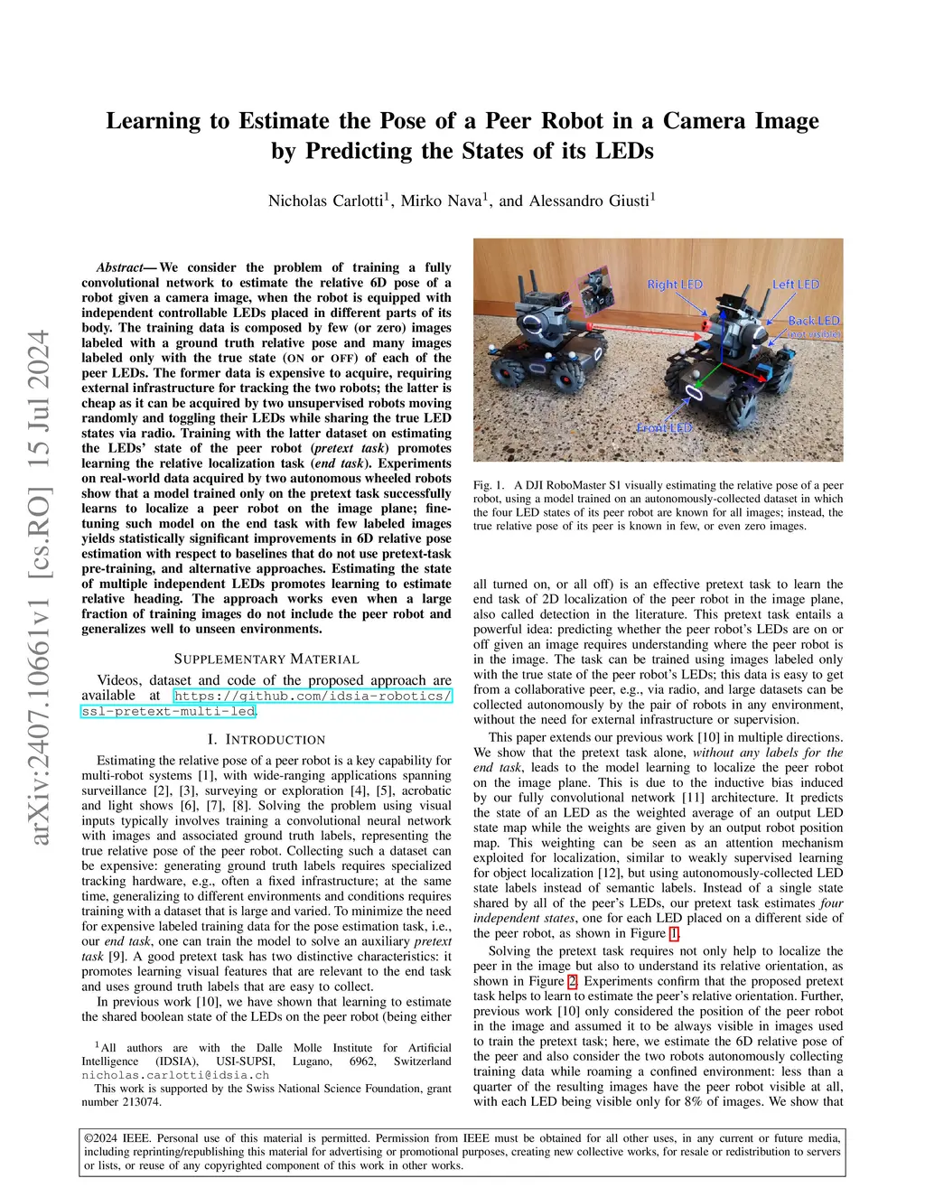 We consider the problem of training a fully convolutional network to estimate the relative 6D pose of a robot given a camera image, when the robot is equipped with independent controllable LEDs placed in different parts of its body. The training data is composed by few (or zero) images labeled with a ground truth relative pose and many images labeled only with the true state (\textsc{on} or \textsc{off}) of each of the peer LEDs. The former data is expensive to acquire, requiring external infrastructure for tracking the two robots; the latter is cheap as it can be acquired by two unsupervised robots moving randomly and toggling their LEDs while sharing the true LED states via radio. Training with the latter dataset on estimating the LEDs' state of the peer robot (\emph{pretext task}) promotes learning the relative localization task (\emph{end task}). Experiments on real-world data acquired by two autonomous wheeled robots show that a model trained only on the pretext task successfully learns to localize a peer robot on the image plane; fine-tuning such model on the end task with few labeled images yields statistically significant improvements in 6D relative pose estimation with respect to baselines that do not use pretext-task pre-training, and alternative approaches. Estimating the state of multiple independent LEDs promotes learning to estimate relative heading. The approach works even when a large fraction of training images do not include the peer robot and generalizes well to unseen environments.