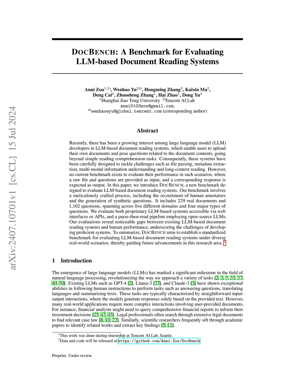 DOCBENCH: A Benchmark for Evaluating LLM-based Document Reading Systems
