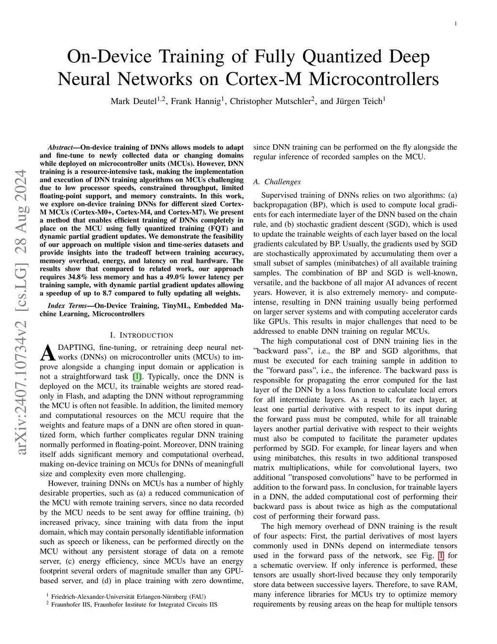 On-device training of DNNs allows models to adapt and fine-tune to newly collected data or changing domains while deployed on microcontroller units (MCUs). However, DNN training is a resource-intensive task, making the implementation and execution of DNN training algorithms on MCUs challenging due to low processor speeds, constrained throughput, limited floating-point support, and memory constraints. In this work, we explore on-device training of DNNs for Cortex-M MCUs. We present a method that enables efficient training of DNNs completely in place on the MCU using fully quantized training (FQT) and dynamic partial gradient updates. We demonstrate the feasibility of our approach on multiple vision and time-series datasets and provide insights into the tradeoff between training accuracy, memory overhead, energy, and latency on real hardware.
