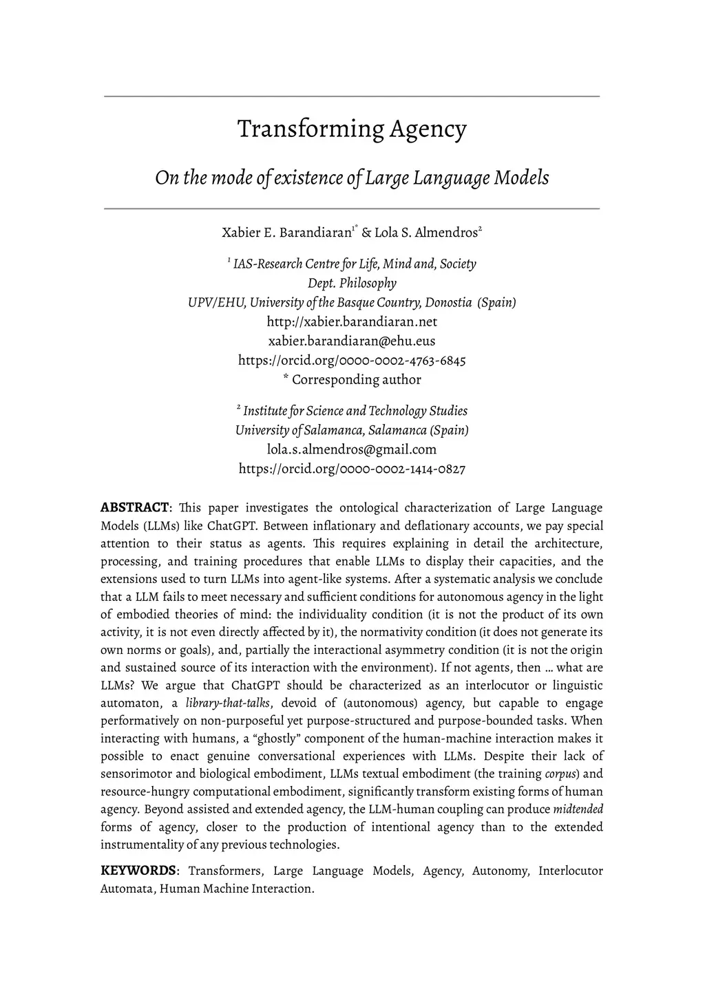 This paper investigates the ontological characterization of Large Language Models (LLMs) like ChatGPT. Between inflationary and deflationary accounts, we pay special attention to their status as agents. This requires explaining in detail the architecture, processing, and training procedures that enable LLMs to display their capacities, and the extensions used to turn LLMs into agent-like systems. After a systematic analysis we conclude that a LLM fails to meet necessary and sufficient conditions for autonomous agency in the light of embodied theories of mind: the individuality condition (it is not the product of its own activity, it is not even directly affected by it), the normativity condition (it does not generate its own norms or goals), and, partially the interactional asymmetry condition (it is not the origin and sustained source of its interaction with the environment). If not agents, then ... what are LLMs? We argue that ChatGPT should be characterized as an interlocutor or linguistic automaton, a library-that-talks, devoid of (autonomous) agency, but capable to engage performatively on non-purposeful yet purpose-structured and purpose-bounded tasks. When interacting with humans, a "ghostly" component of the human-machine interaction makes it possible to enact genuine conversational experiences with LLMs. Despite their lack of sensorimotor and biological embodiment, LLMs textual embodiment (the training corpus) and resource-hungry computational embodiment, significantly transform existing forms of human agency. Beyond assisted and extended agency, the LLM-human coupling can produce midtended forms of agency, closer to the production of intentional agency than to the extended instrumentality of any previous technologies.