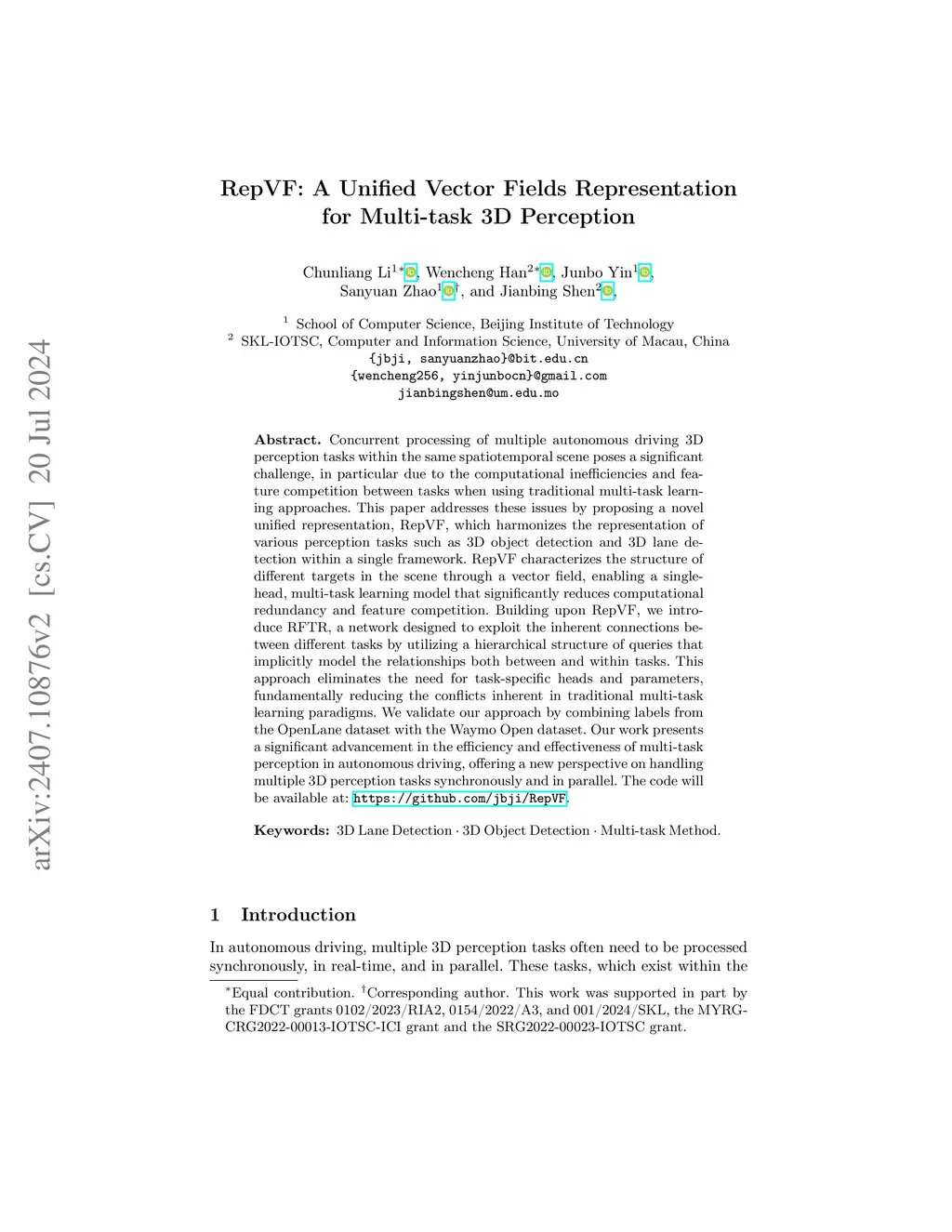Concurrent processing of multiple autonomous driving 3D perception tasks within the same spatiotemporal scene poses a significant challenge, in particular due to the computational inefficiencies and feature competition between tasks when using traditional multi-task learning approaches. This paper addresses these issues by proposing a novel unified representation, RepVF, which harmonizes the representation of various perception tasks such as 3D object detection and 3D lane detection within a single framework. RepVF characterizes the structure of different targets in the scene through a vector field, enabling a single-head, multi-task learning model that significantly reduces computational redundancy and feature competition. Building upon RepVF, we introduce RFTR, a network designed to exploit the inherent connections between different tasks by utilizing a hierarchical structure of queries that implicitly model the relationships both between and within tasks. This approach eliminates the need for task-specific heads and parameters, fundamentally reducing the conflicts inherent in traditional multi-task learning paradigms. We validate our approach by combining labels from the OpenLane dataset with the Waymo Open dataset. Our work presents a significant advancement in the efficiency and effectiveness of multi-task perception in autonomous driving, offering a new perspective on handling multiple 3D perception tasks synchronously and in parallel. The code will be available at: https://github.com/jbji/RepVF