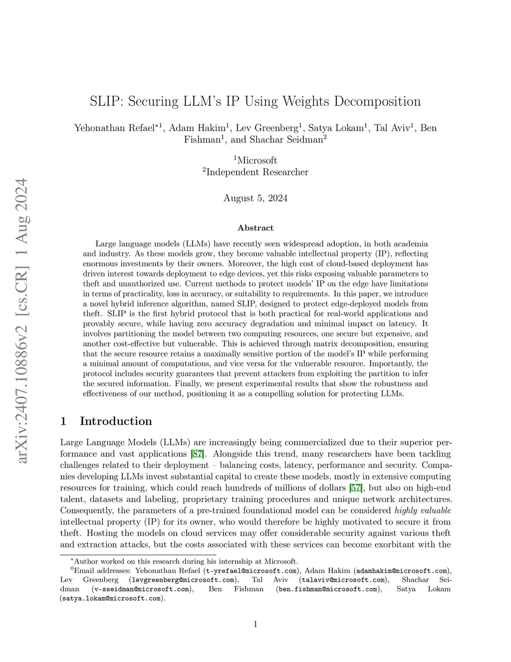 SLIP: Securing LLMs IP Using Weights Decomposition