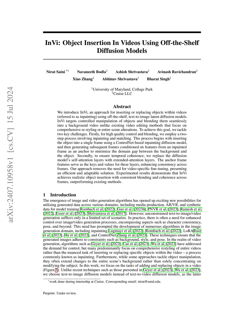We introduce InVi, an approach for inserting or replacing objects within videos (referred to as inpainting) using off-the-shelf, text-to-image latent diffusion models. InVi targets controlled manipulation of objects and blending them seamlessly into a background video unlike existing video editing methods that focus on comprehensive re-styling or entire scene alterations. To achieve this goal, we tackle two key challenges. Firstly, for high quality control and blending, we employ a two-step process involving inpainting and matching. This process begins with inserting the object into a single frame using a ControlNet-based inpainting diffusion model, and then generating subsequent frames conditioned on features from an inpainted frame as an anchor to minimize the domain gap between the background and the object. Secondly, to ensure temporal coherence, we replace the diffusion model's self-attention layers with extended-attention layers. The anchor frame features serve as the keys and values for these layers, enhancing consistency across frames. Our approach removes the need for video-specific fine-tuning, presenting an efficient and adaptable solution. Experimental results demonstrate that InVi achieves realistic object insertion with consistent blending and coherence across frames, outperforming existing methods.