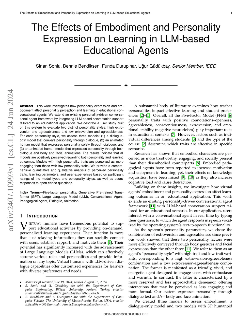 This work investigates how personality expression and embodiment affect personality perception and learning in educational conversational agents. We extend an existing personality-driven conversational agent framework by integrating LLM-based conversation support tailored to an educational application. We describe a user study built on this system to evaluate two distinct personality styles: high extroversion and agreeableness and low extroversion and agreeableness. For each personality style, we assess three models: (1) a dialogue-only model that conveys personality through dialogue, (2) an animated human model that expresses personality solely through dialogue, and (3) an animated human model that expresses personality through both dialogue and body and facial animations. The results indicate that all models are positively perceived regarding both personality and learning outcomes. Models with high personality traits are perceived as more engaging than those with low personality traits. We provide a comprehensive quantitative and qualitative analysis of perceived personality traits, learning parameters, and user experiences based on participant ratings of the model types and personality styles, as well as users' responses to open-ended questions.