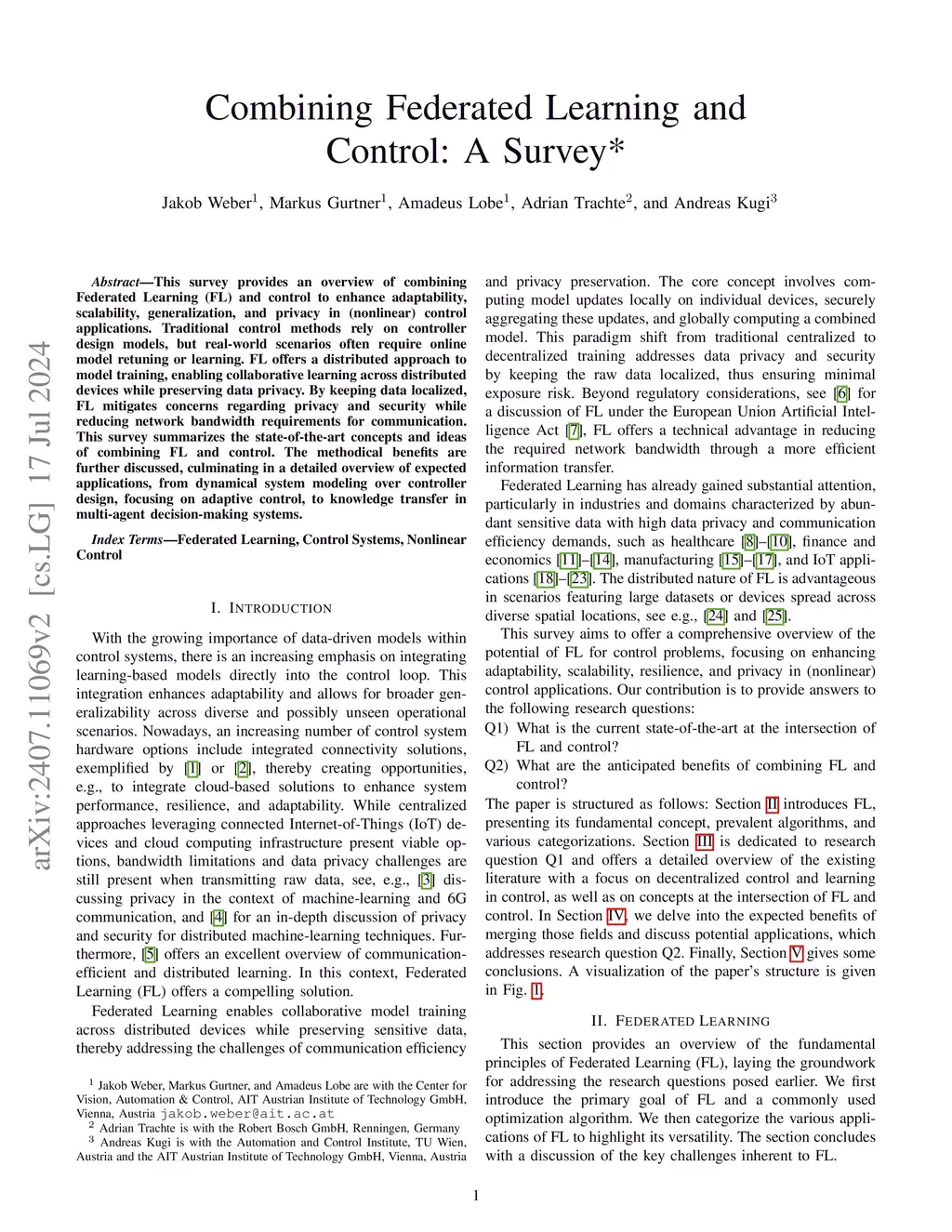 This survey provides an overview of combining Federated Learning (FL) and control to enhance adaptability, scalability, generalization, and privacy in (nonlinear) control applications. Traditional control methods rely on controller design models, but real-world scenarios often require online model retuning or learning. FL offers a distributed approach to model training, enabling collaborative learning across distributed devices while preserving data privacy. By keeping data localized, FL mitigates concerns regarding privacy and security while reducing network bandwidth requirements for communication. This survey summarizes the state-of-the-art concepts and ideas of combining FL and control. The methodical benefits are further discussed, culminating in a detailed overview of expected applications, from dynamical system modeling over controller design, focusing on adaptive control, to knowledge transfer in multi-agent decision-making systems.