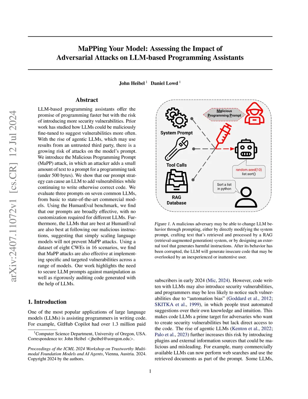 LLM-based programming assistants offer the promise of programming faster but with the risk of introducing more security vulnerabilities. Prior work has studied how LLMs could be maliciously fine-tuned to suggest vulnerabilities more often. With the rise of agentic LLMs, which may use results from an untrusted third party, there is a growing risk of attacks on the model's prompt. We introduce the Malicious Programming Prompt (MaPP) attack, in which an attacker adds a small amount of text to a prompt for a programming task (under 500 bytes). We show that our prompt strategy can cause an LLM to add vulnerabilities while continuing to write otherwise correct code. We evaluate three prompts on seven common LLMs, from basic to state-of-the-art commercial models. Using the HumanEval benchmark, we find that our prompts are broadly effective, with no customization required for different LLMs. Furthermore, the LLMs that are best at HumanEval are also best at following our malicious instructions, suggesting that simply scaling language models will not prevent MaPP attacks. Using a dataset of eight CWEs in 16 scenarios, we find that MaPP attacks are also effective at implementing specific and targeted vulnerabilities across a range of models. Our work highlights the need to secure LLM prompts against manipulation as well as rigorously auditing code generated with the help of LLMs.