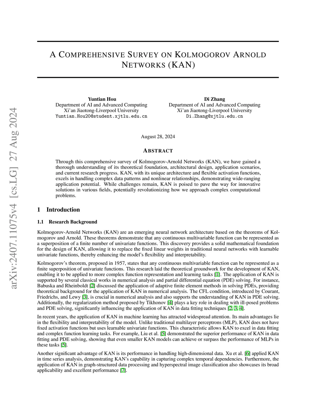 Through this comprehensive survey of Kolmogorov-Arnold Networks(KAN), we have gained a thorough understanding of its theoretical foundation, architectural design, application scenarios, and current research progress. KAN, with its unique architecture and flexible activation functions, excels in handling complex data patterns and nonlinear relationships, demonstrating wide-ranging application potential. While challenges remain, KAN is poised to pave the way for innovative solutions in various fields, potentially revolutionizing how we approach complex computational problems.