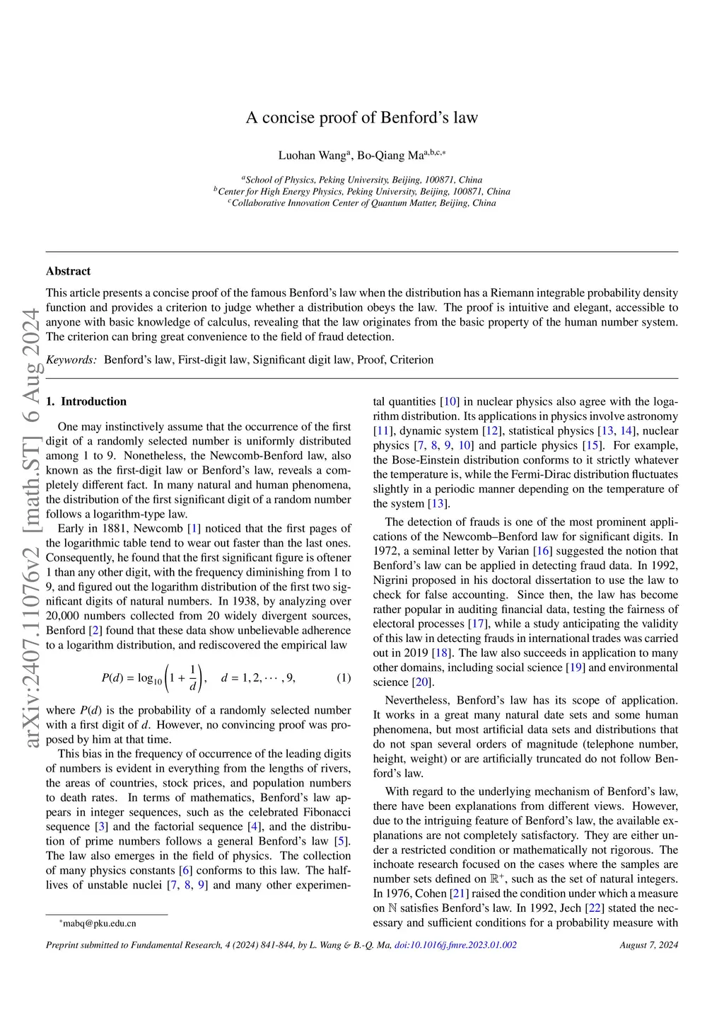 This article presents a concise proof of the famous Benford's law when the distribution has a Riemann integrable probability density function and provides a criterion to judge whether a distribution obeys the law. The proof is intuitive and elegant, accessible to anyone with basic knowledge of calculus, revealing that the law originates from the basic property of the human number system. The criterion can bring great convenience to the field of fraud detection.