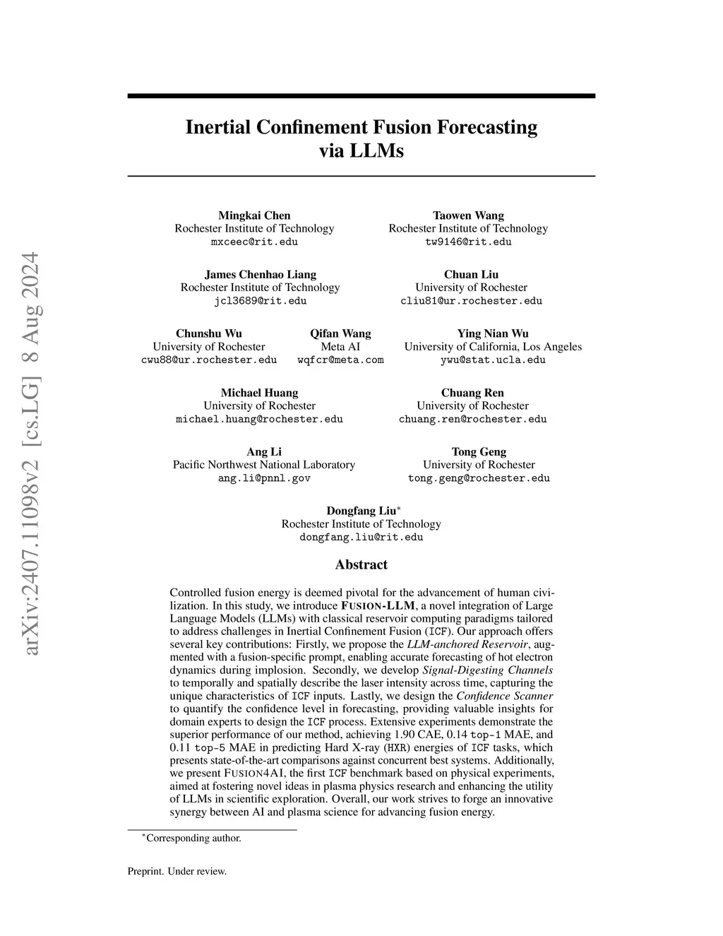 Controlled fusion energy is deemed pivotal for the advancement of human civilization. In this study, we introduce Fusion-LLM\textbf{Fusion-LLM}, a novel integration of Large Language Models (LLMs) with classical reservoir computing paradigms tailored to address challenges in Inertial Confinement Fusion (ICF\texttt{ICF}). Our approach offers several key contributions: Firstly, we propose the LLM-anchored Reservoir\textit{LLM-anchored Reservoir}, augmented with a fusion-specific prompt, enabling accurate forecasting of hot electron dynamics during implosion. Secondly, we develop Signal-Digesting Channels\textit{Signal-Digesting Channels} to temporally and spatially describe the laser intensity across time, capturing the unique characteristics of ICF\texttt{ICF} inputs. Lastly, we design the Confidence Scanner\textit{Confidence Scanner} to quantify the confidence level in forecasting, providing valuable insights for domain experts to design the ICF\texttt{ICF} process. Extensive experiments demonstrate the superior performance of our method, achieving 1.90 CAE, 0.14 top-1\texttt{top-1} MAE, and 0.11 top-5\texttt{top-5} MAE in predicting Hard X-ray (HXR\texttt{HXR}) energies of ICF\texttt{ICF} tasks, which presents state-of-the-art comparisons against concurrent best systems. Additionally, we present Fusion4AI\textbf{Fusion4AI}, the first ICF\texttt{ICF} benchmark based on physical experiments, aimed at fostering novel ideas in plasma physics research and enhancing the utility of LLMs in scientific exploration. Overall, our work strives to forge an innovative synergy between AI and plasma science for advancing fusion energy.