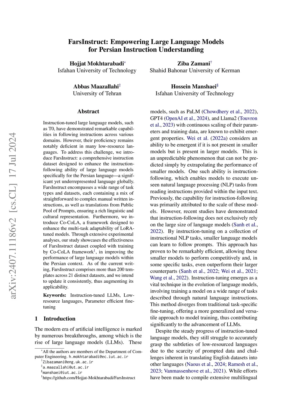 Instruction-tuned large language models have demonstrated remarkable capabilities in following human instructions across various domains. However, their proficiency remains notably deficient in many low-resource languages. To address this challenge, we begin by introducing FarsInstruct a comprehensive instruction dataset designed to enhance the instruction following ability of large language models specifically for the Persian language a significant yet underrepresented language globally. FarsInstruct encompasses a wide range of task types and datasets, each containing a mix of straightforward to complex manual written instructions, as well as translations from the Public Pool of Prompts, ensuring a rich linguistic and cultural representation. Furthermore, we introduce Co-CoLA, a framework designed to enhance the multi-task adaptability of LoRA-tuned models. Through extensive experimental analyses, our study showcases the effectiveness of the FarsInstruct dataset coupled with training by the Co-CoLA framework, in improving the performance of large language models within the Persian context. As of the current writing, FarsInstruct comprises 197 templates across 21 distinct datasets, and we intend to update it consistently, thus augmenting its applicability.
