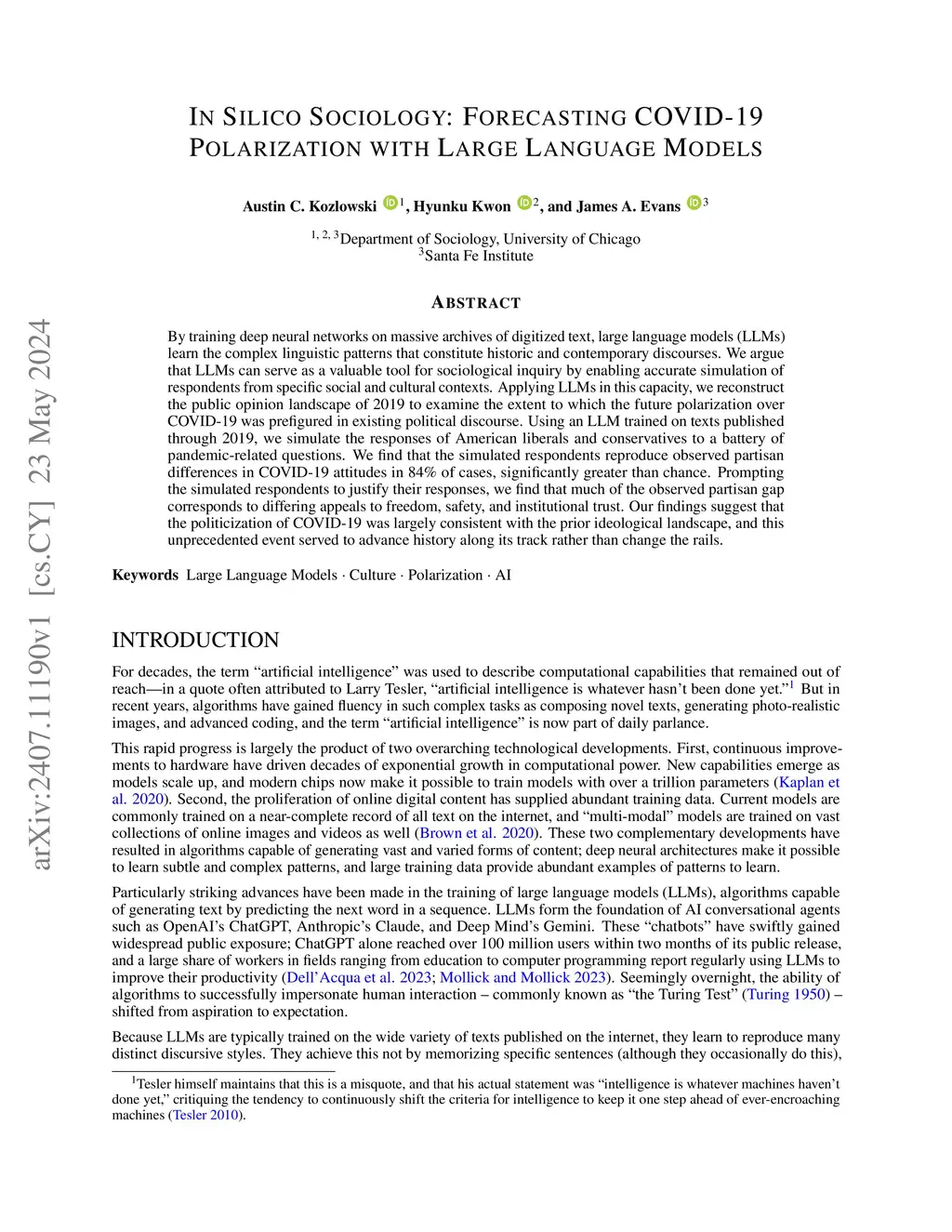 By training deep neural networks on massive archives of digitized text, large language models (LLMs) learn the complex linguistic patterns that constitute historic and contemporary discourses. We argue that LLMs can serve as a valuable tool for sociological inquiry by enabling accurate simulation of respondents from specific social and cultural contexts. Applying LLMs in this capacity, we reconstruct the public opinion landscape of 2019 to examine the extent to which the future polarization over COVID-19 was prefigured in existing political discourse. Using an LLM trained on texts published through 2019, we simulate the responses of American liberals and conservatives to a battery of pandemic-related questions. We find that the simulated respondents reproduce observed partisan differences in COVID-19 attitudes in 84% of cases, significantly greater than chance. Prompting the simulated respondents to justify their responses, we find that much of the observed partisan gap corresponds to differing appeals to freedom, safety, and institutional trust. Our findings suggest that the politicization of COVID-19 was largely consistent with the prior ideological landscape, and this unprecedented event served to advance history along its track rather than change the rails.