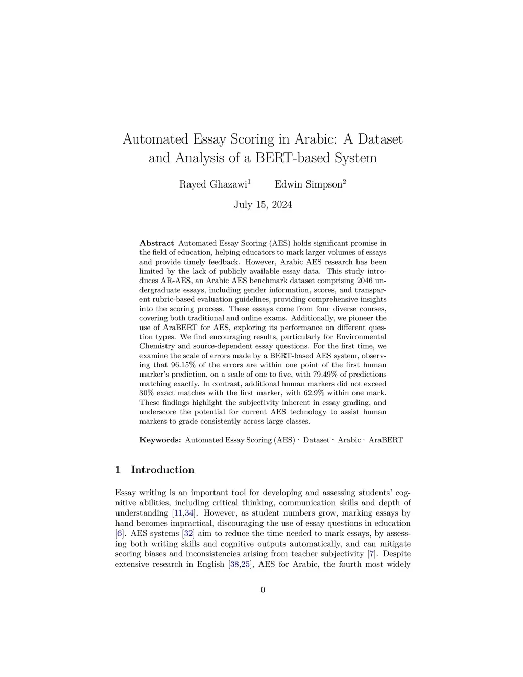 Automated Essay Scoring (AES) holds significant promise in the field of education, helping educators to mark larger volumes of essays and provide timely feedback. However, Arabic AES research has been limited by the lack of publicly available essay data. This study introduces AR-AES, an Arabic AES benchmark dataset comprising 2046 undergraduate essays, including gender information, scores, and transparent rubric-based evaluation guidelines, providing comprehensive insights into the scoring process. These essays come from four diverse courses, covering both traditional and online exams. Additionally, we pioneer the use of AraBERT for AES, exploring its performance on different question types. We find encouraging results, particularly for Environmental Chemistry and source-dependent essay questions. For the first time, we examine the scale of errors made by a BERT-based AES system, observing that 96.15 percent of the errors are within one point of the first human marker's prediction, on a scale of one to five, with 79.49 percent of predictions matching exactly. In contrast, additional human markers did not exceed 30 percent exact matches with the first marker, with 62.9 percent within one mark. These findings highlight the subjectivity inherent in essay grading, and underscore the potential for current AES technology to assist human markers to grade consistently across large classes.