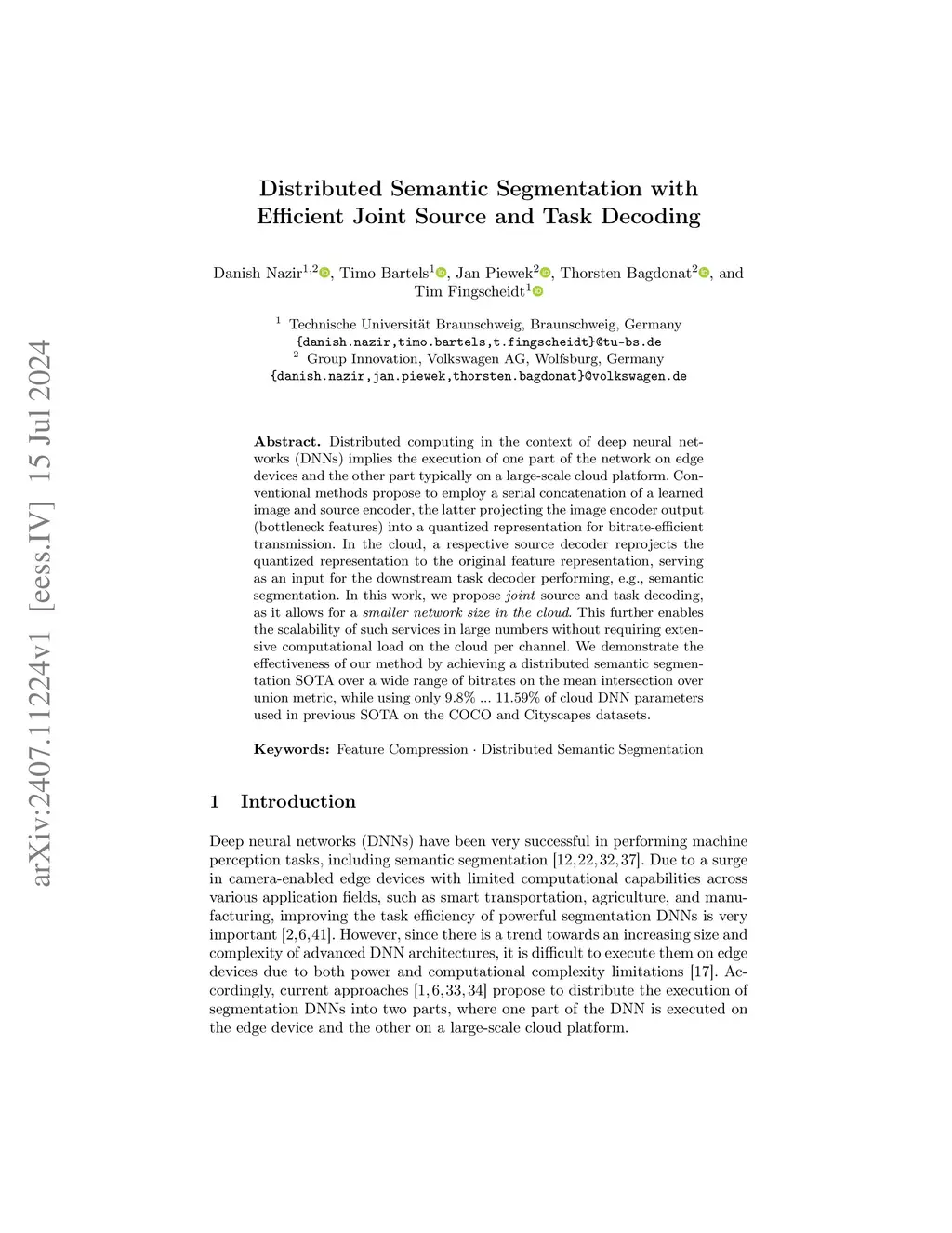Distributed computing in the context of deep neural networks (DNNs) implies the execution of one part of the network on edge devices and the other part typically on a large-scale cloud platform. Conventional methods propose to employ a serial concatenation of a learned image and source encoder, the latter projecting the image encoder output (bottleneck features) into a quantized representation for bitrate-efficient transmission. In the cloud, a respective source decoder reprojects the quantized representation to the original feature representation, serving as an input for the downstream task decoder performing, e.g., semantic segmentation. In this work, we propose joint source and task decoding, as it allows for a smaller network size in the cloud. This further enables the scalability of such services in large numbers without requiring extensive computational load on the cloud per channel. We demonstrate the effectiveness of our method by achieving a distributed semantic segmentation SOTA over a wide range of bitrates on the mean intersection over union metric, while using only ... of cloud DNN parameters used in the previous SOTA on the COCO and Cityscapes datasets.
