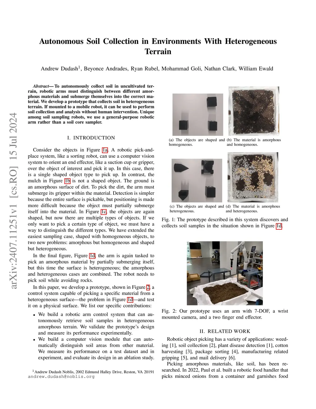 To autonomously collect soil in uncultivated terrain, robotic arms must distinguish between different amorphous materials and submerge themselves into the correct material. We develop a prototype that collects soil in heterogeneous terrain. If mounted to a mobile robot, it can be used to perform soil collection and analysis without human intervention. Unique among soil sampling robots, we use a general-purpose robotic arm rather than a soil core sampler.