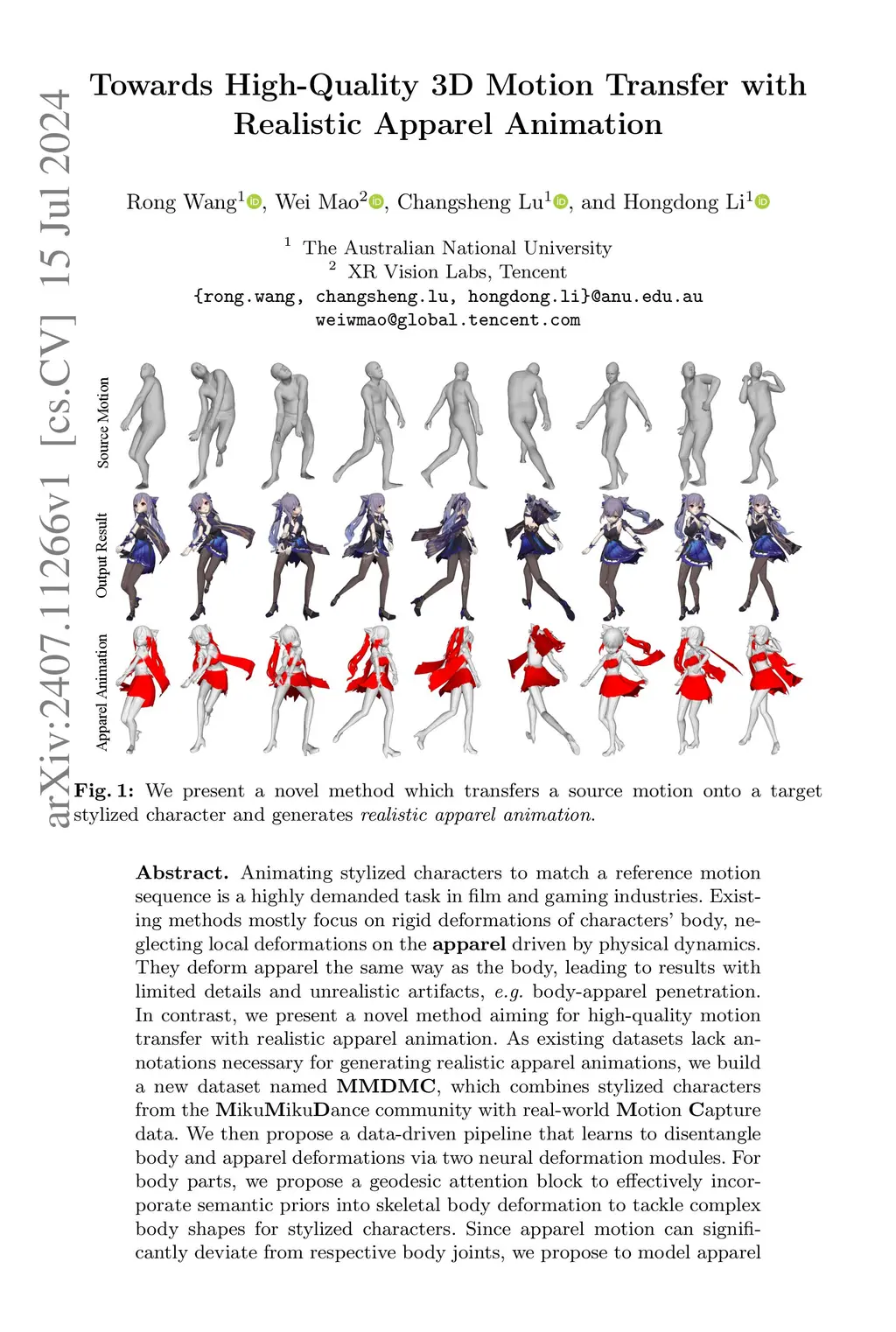 Animating stylized characters to match a reference motion sequence is a highly demanded task in film and gaming industries. Existing methods mostly focus on rigid deformations of characters' body, neglecting local deformations on the apparel driven by physical dynamics. They deform apparel the same way as the body, leading to results with limited details and unrealistic artifacts, e.g. body-apparel penetration. In contrast, we present a novel method aiming for high-quality motion transfer with realistic apparel animation. As existing datasets lack annotations necessary for generating realistic apparel animations, we build a new dataset named MMDMC, which combines stylized characters from the MikuMikuDance community with real-world Motion Capture data. We then propose a data-driven pipeline that learns to disentangle body and apparel deformations via two neural deformation modules. For body parts, we propose a geodesic attention block to effectively incorporate semantic priors into skeletal body deformation to tackle complex body shapes for stylized characters. Since apparel motion can significantly deviate from respective body joints, we propose to model apparel deformation in a non-linear vertex displacement field conditioned on its historic states. Extensive experiments show that our method produces results with superior quality for various types of apparel. Our dataset is released in https://github.com/rongakowang/MMDMC.