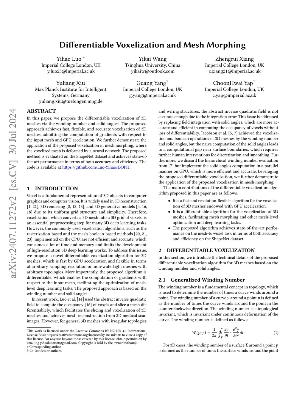 In this paper, we propose the differentiable voxelization of 3D meshes via the winding number and solid angles. The proposed approach achieves fast, flexible, and accurate voxelization of 3D meshes, admitting the computation of gradients with respect to the input mesh and GPU acceleration. We further demonstrate the application of the proposed voxelization in mesh morphing, where the voxelized mesh is deformed by a neural network. The proposed method is evaluated on the ShapeNet dataset and achieves state-of-the-art performance in terms of both accuracy and efficiency.