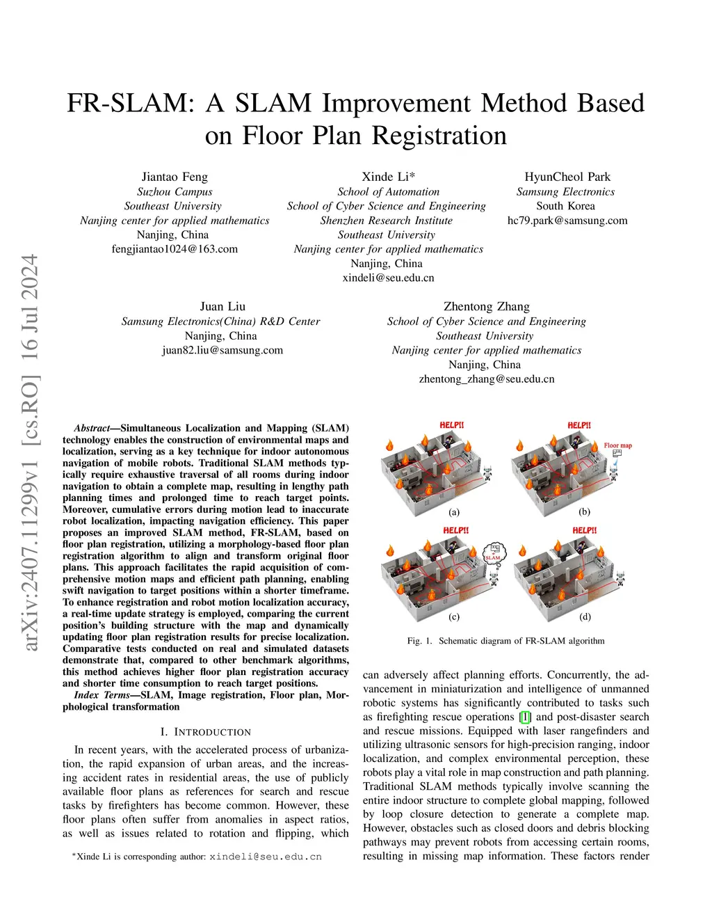Simultaneous Localization and Mapping (SLAM) technology enables the construction of environmental maps and localization, serving as a key technique for indoor autonomous navigation of mobile robots. Traditional SLAM methods typically require exhaustive traversal of all rooms during indoor navigation to obtain a complete map, resulting in lengthy path planning times and prolonged time to reach target points. Moreover, cumulative errors during motion lead to inaccurate robot localization, impacting navigation efficiency.This paper proposes an improved SLAM method, FR-SLAM, based on floor plan registration, utilizing a morphology-based floor plan registration algorithm to align and transform original floor plans. This approach facilitates the rapid acquisition of comprehensive motion maps and efficient path planning, enabling swift navigation to target positions within a shorter timeframe. To enhance registration and robot motion localization accuracy, a real-time update strategy is employed, comparing the current position's building structure with the map and dynamically updating floor plan registration results for precise localization. Comparative tests conducted on real and simulated datasets demonstrate that, compared to other benchmark algorithms, this method achieves higher floor plan registration accuracy and shorter time consumption to reach target positions.