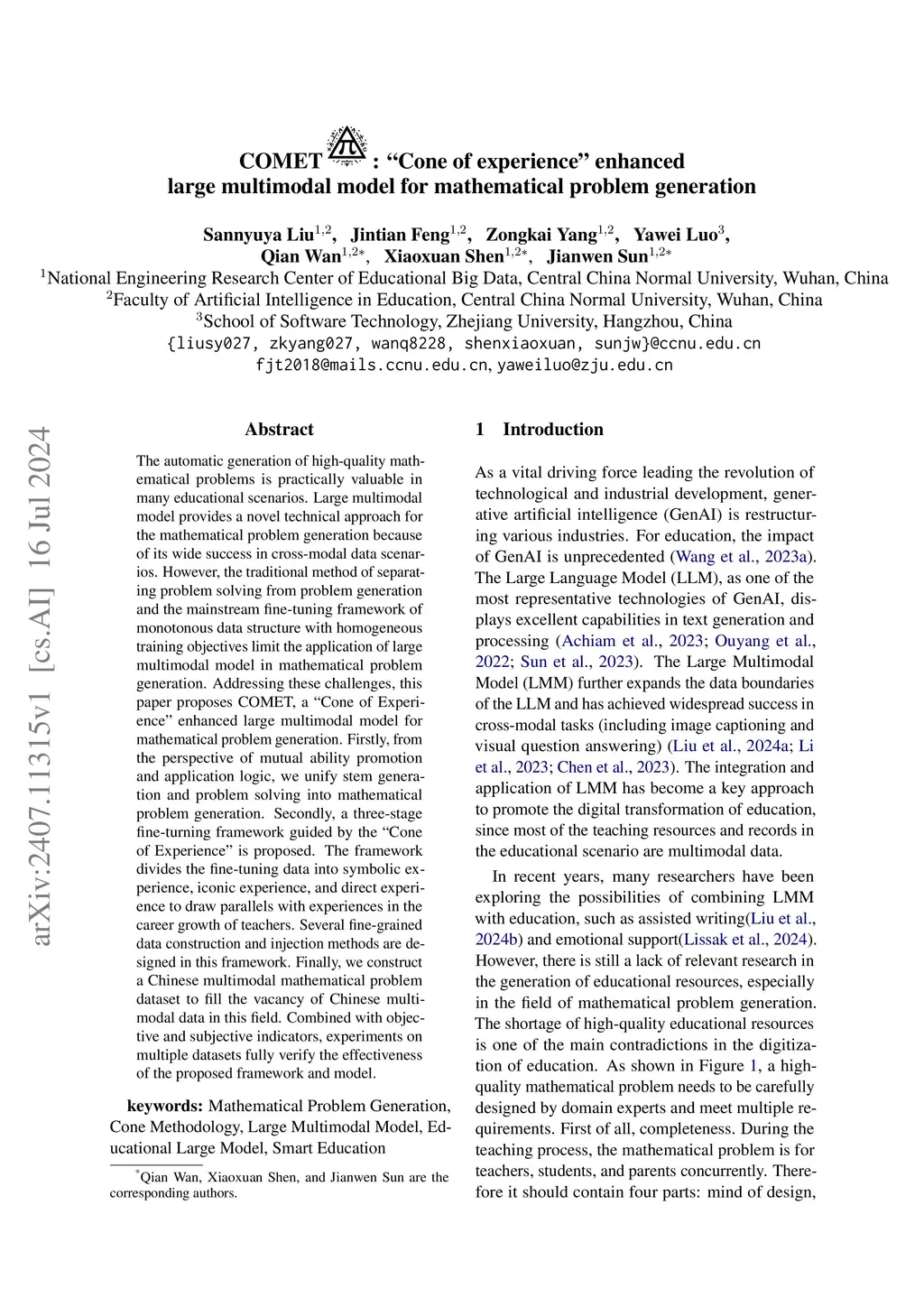 The automatic generation of high-quality mathematical problems is practically valuable in many educational scenarios. Large multimodal model provides a novel technical approach for the mathematical problem generation because of its wide success in cross-modal data scenarios. However, the traditional method of separating problem solving from problem generation and the mainstream fine-tuning framework of monotonous data structure with homogeneous training objectives limit the application of large multimodal model in mathematical problem generation. Addressing these challenges, this paper proposes COMET, a "Cone of Experience" enhanced large multimodal model for mathematical problem generation. Firstly, from the perspective of mutual ability promotion and application logic, we unify stem generation and problem solving into mathematical problem generation. Secondly, a three-stage fine-turning framework guided by the "Cone of Experience" is proposed. The framework divides the fine-tuning data into symbolic experience, iconic experience, and direct experience to draw parallels with experiences in the career growth of teachers. Several fine-grained data construction and injection methods are designed in this framework. Finally, we construct a Chinese multimodal mathematical problem dataset to fill the vacancy of Chinese multimodal data in this field. Combined with objective and subjective indicators, experiments on multiple datasets fully verify the effectiveness of the proposed framework and model.