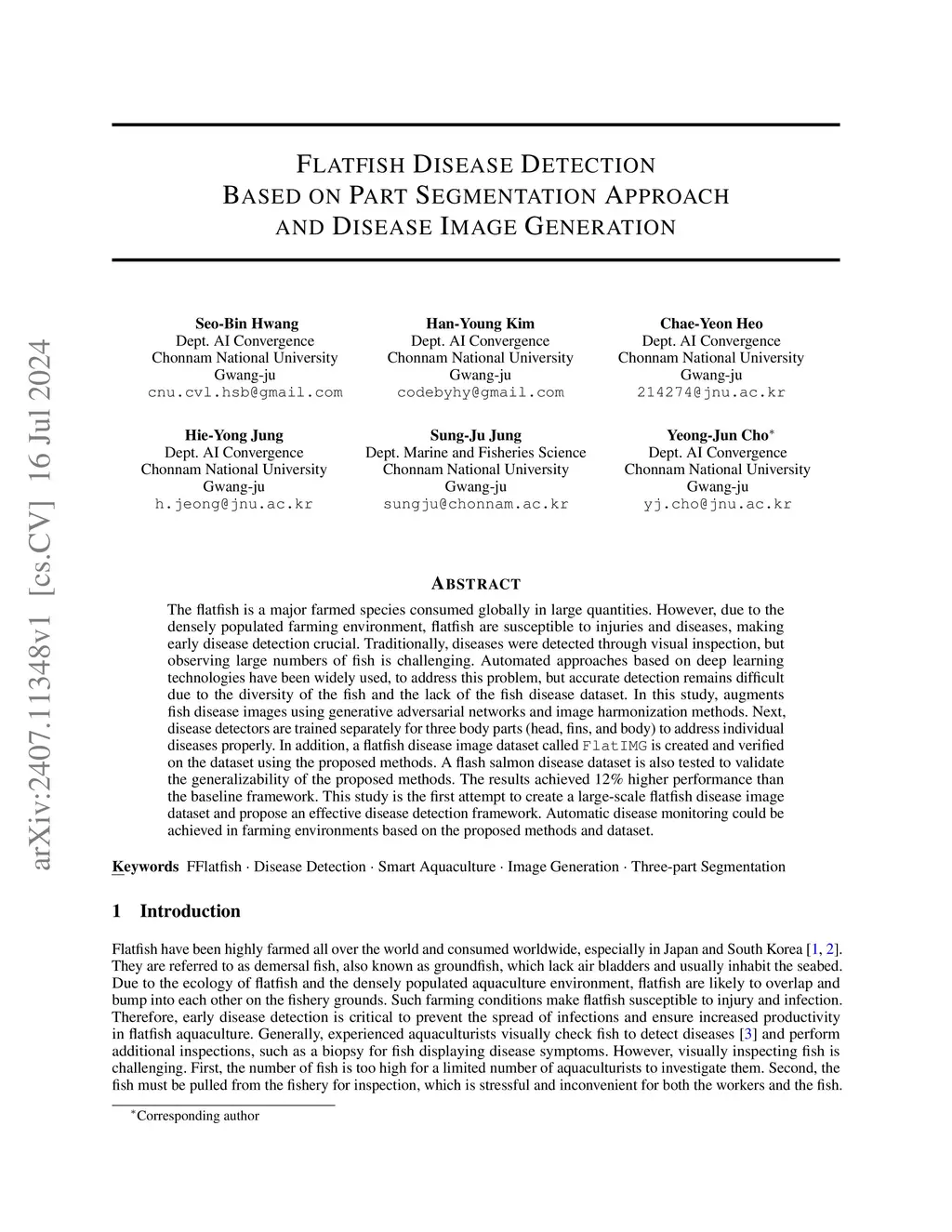 The flatfish is a major farmed species consumed globally in large quantities. However, due to the densely populated farming environment, flatfish are susceptible to lesions and diseases, making early lesion detection crucial. Traditionally, lesions were detected through visual inspection, but observing large numbers of fish is challenging. Automated approaches based on deep learning technologies have been widely used to address this problem, but accurate detection remains difficult due to the diversity of the fish and the lack of a fish lesion and disease dataset. This study augments fish lesion images using generative adversarial networks and image harmonization methods. Next, lesion detectors are trained separately for three body parts (head, fins, and body) to address individual lesions properly. Additionally, a flatfish lesion and disease image dataset, called FlatIMG, is created and verified using the proposed methods on the dataset. A flash salmon lesion dataset is also tested to validate the generalizability of the proposed methods. The results achieved 12% higher performance than the baseline framework. This study is the first attempt to create a high-quality flatfish lesion image dataset with detailed annotations and propose an effective lesion detection framework. Automatic lesion and disease monitoring can be achieved in farming environments using the proposed methods and dataset.