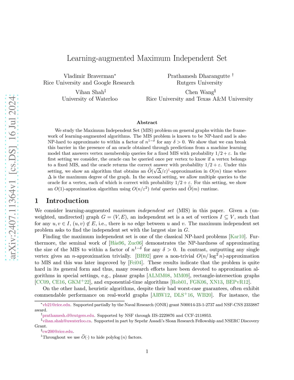 We study the Maximum Independent Set (MIS) problem on general graphs within the framework of learning-augmented algorithms. The MIS problem is known to be NP-hard and is also NP-hard to approximate to within a factor of for any . We show that we can break this barrier in the presence of an oracle obtained through predictions from a machine learning model that answers vertex membership queries for a fixed MIS with probability . In the first setting we consider, the oracle can be queried once per vertex to know if a vertex belongs to a fixed MIS, and the oracle returns the correct answer with probability . Under this setting, we show an algorithm that obtains an -approximation in time where is the maximum degree of the graph. In the second setting, we allow multiple queries to the oracle for a vertex, each of which is correct with probability . For this setting, we show an -approximation algorithm using total queries and runtime.