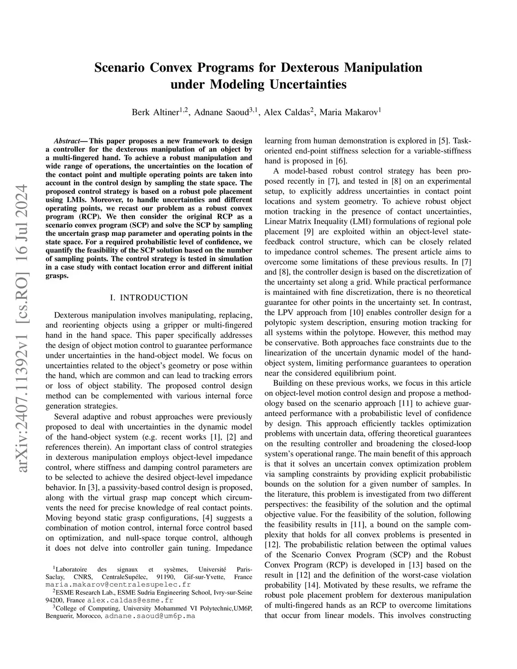 This paper proposes a new framework to design a controller for the dexterous manipulation of an object by a multi-fingered hand. To achieve a robust manipulation and wide range of operations, the uncertainties on the location of the contact point and multiple operating points are taken into account in the control design by sampling the state space. The proposed control strategy is based on a robust pole placement using LMIs. Moreover, to handle uncertainties and different operating points, we recast our problem as a robust convex program (RCP). We then consider the original RCP as a scenario convex program (SCP) and solve the SCP by sampling the uncertain grasp map parameter and operating points in the state space. For a required probabilistic level of confidence, we quantify the feasibility of the SCP solution based on the number of sampling points. The control strategy is tested in simulation in a case study with contact location error and different initial grasps.