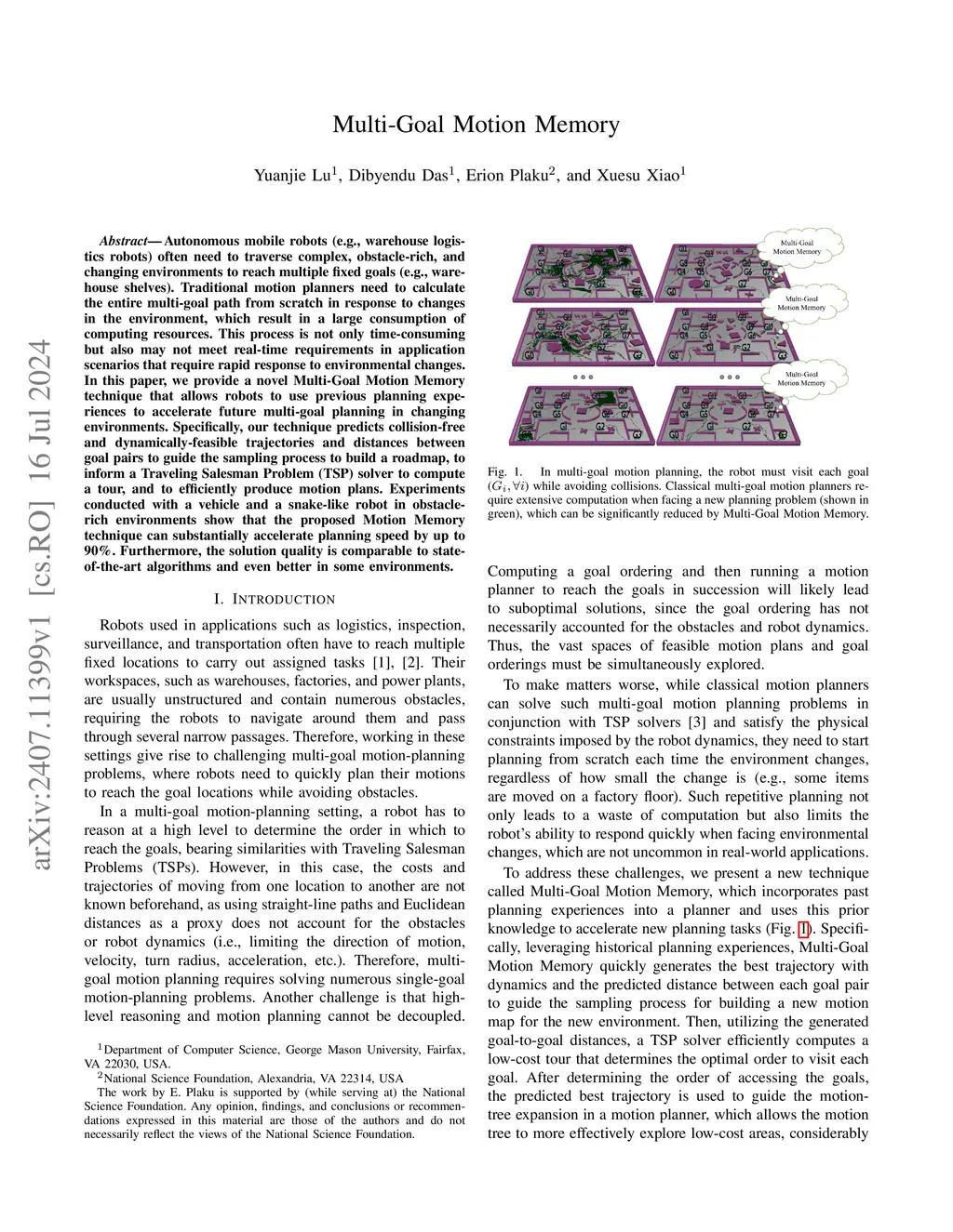 Autonomous mobile robots (e.g., warehouse logistics robots) often need to traverse complex, obstacle-rich, and changing environments to reach multiple fixed goals (e.g., warehouse shelves). Traditional motion planners need to calculate the entire multi-goal path from scratch in response to changes in the environment, which result in a large consumption of computing resources. This process is not only time-consuming but also may not meet real-time requirements in application scenarios that require rapid response to environmental changes. In this paper, we provide a novel Multi-Goal Motion Memory technique that allows robots to use previous planning experiences to accelerate future multi-goal planning in changing environments. Specifically, our technique predicts collision-free and dynamically-feasible trajectories and distances between goal pairs to guide the sampling process to build a roadmap, to inform a Traveling Salesman Problem (TSP) solver to compute a tour, and to efficiently produce motion plans. Experiments conducted with a vehicle and a snake-like robot in obstacle-rich environments show that the proposed Motion Memory technique can substantially accelerate planning speed by up to 90\%. Furthermore, the solution quality is comparable to state-of-the-art algorithms and even better in some environments.