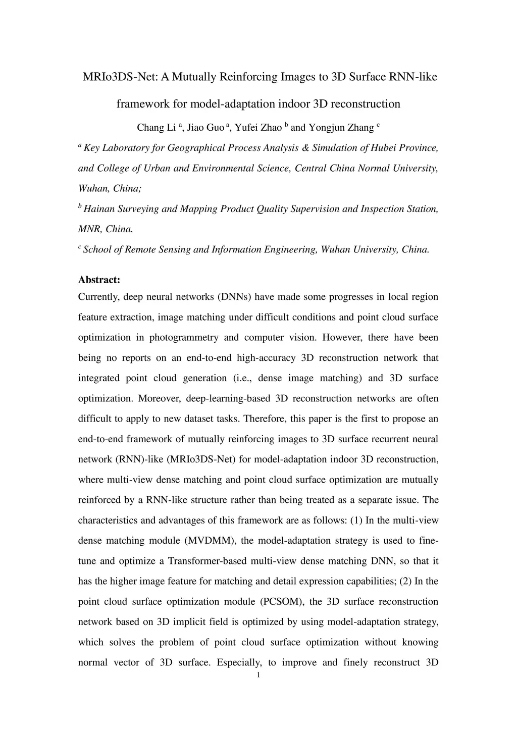 This paper is the first to propose an end-to-end framework of mutually reinforcing images to 3D surface recurrent neural network-like for model-adaptation indoor 3D reconstruction,where multi-view dense matching and point cloud surface optimization are mutually reinforced by a RNN-like structure rather than being treated as a separate issue.The characteristics are as follows:In the multi-view dense matching module, the model-adaptation strategy is used to fine-tune and optimize a Transformer-based multi-view dense matching DNN,so that it has the higher image feature for matching and detail expression capabilities;In the point cloud surface optimization module,the 3D surface reconstruction network based on 3D implicit field is optimized by using model-adaptation strategy,which solves the problem of point cloud surface optimization without knowing normal vector of 3D surface.To improve and finely reconstruct 3D surfaces from point cloud,smooth loss is proposed and added to this module;The MRIo3DS-Net is a RNN-like framework,which utilizes the finely optimized 3D surface obtained by PCSOM to recursively reinforce the differentiable warping for optimizing MVDMM.This refinement leads to achieving better dense matching results, and better dense matching results leads to achieving better 3D surface results recursively and mutually.Hence, model-adaptation strategy can better collaborate the differences between the two network modules,so that they complement each other to achieve the better effect;To accelerate the transfer learning and training convergence from source domain to target domain,a multi-task loss function based on Bayesian uncertainty is used to adaptively adjust the weights between the two networks loss functions of MVDMM and PCSOM;In this multi-task cascade network framework,any modules can be replaced by any state-of-the-art networks to achieve better 3D reconstruction results.