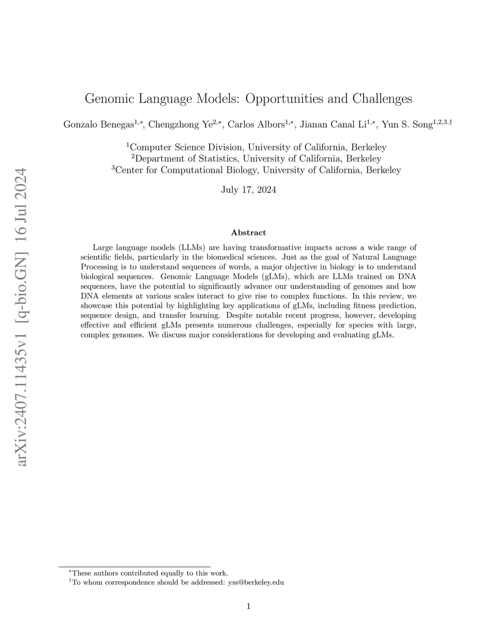 Large language models (LLMs) are having transformative impacts across a wide range of scientific fields, particularly in the biomedical sciences. Just as the goal of Natural Language Processing is to understand sequences of words, a major objective in biology is to understand biological sequences. Genomic Language Models (gLMs), which are LLMs trained on DNA sequences, have the potential to significantly advance our understanding of genomes and how DNA elements at various scales interact to give rise to complex functions. In this review, we showcase this potential by highlighting key applications of gLMs, including fitness prediction, sequence design, and transfer learning. Despite notable recent progress, however, developing effective and efficient gLMs presents numerous challenges, especially for species with large, complex genomes. We discuss major considerations for developing and evaluating gLMs.