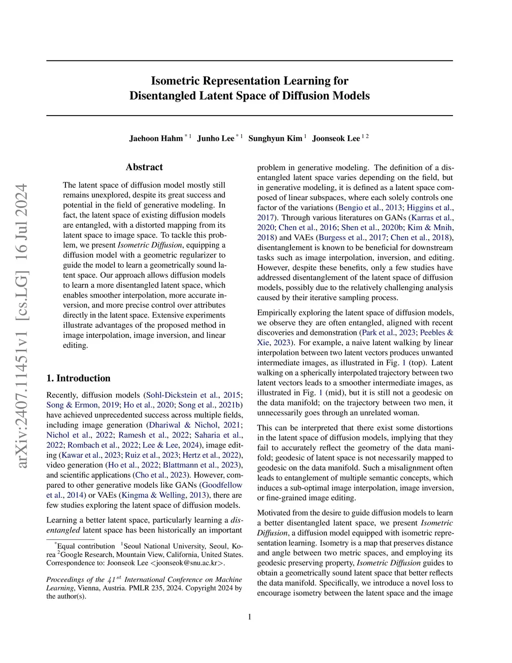 The latent space of diffusion model mostly still remains unexplored, despite its great success and potential in the field of generative modeling. In fact, the latent space of existing diffusion models are entangled, with a distorted mapping from its latent space to image space. To tackle this problem, we present Isometric Diffusion, equipping a diffusion model with a geometric regularizer to guide the model to learn a geometrically sound latent space of the training data manifold. This approach allows diffusion models to learn a more disentangled latent space, which enables smoother interpolation, more accurate inversion, and more precise control over attributes directly in the latent space. Our extensive experiments consisting of image interpolations, image inversions, and linear editing show the effectiveness of our method.