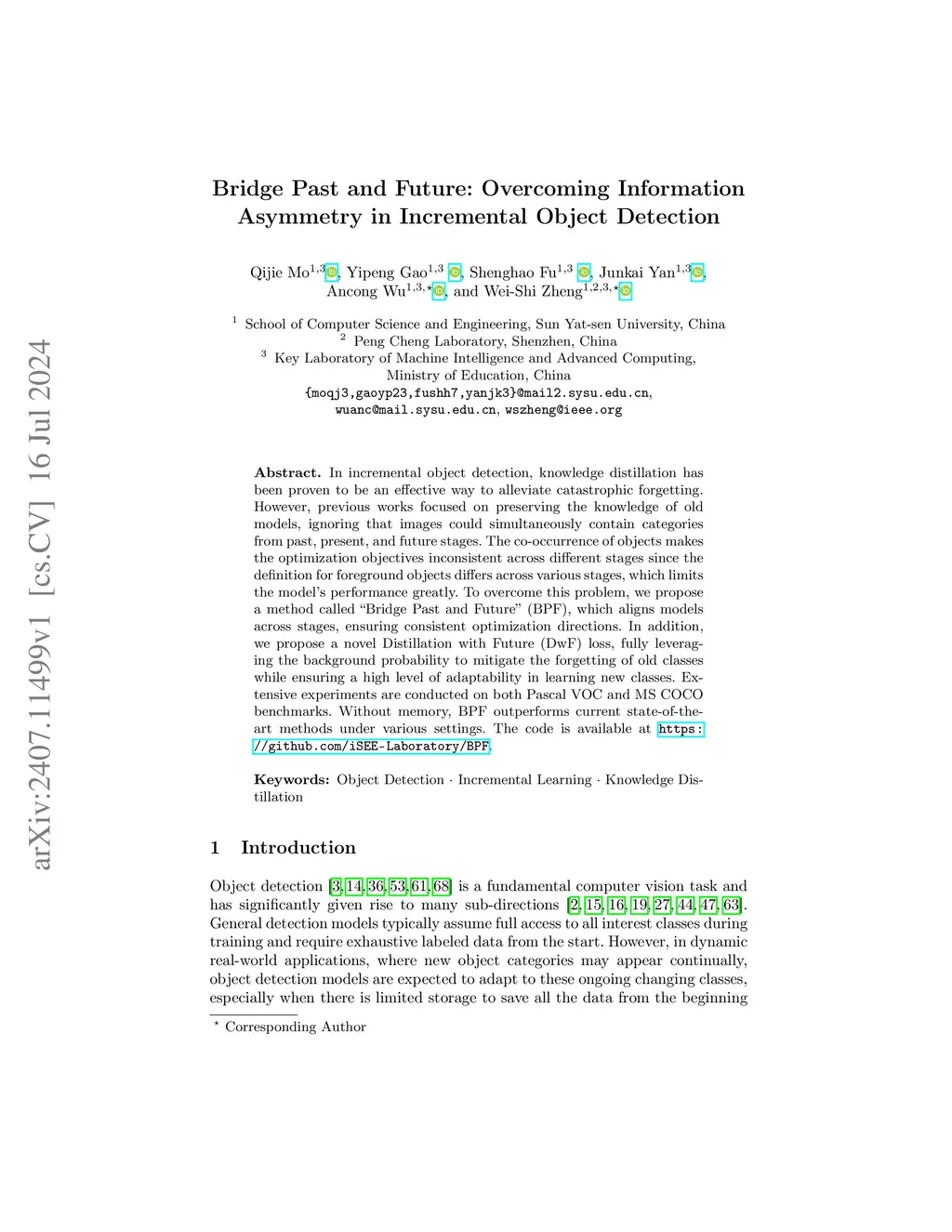 In incremental object detection, knowledge distillation has been proven to be an effective way to alleviate catastrophic forgetting. However, previous works focused on preserving the knowledge of old models, ignoring that images could simultaneously contain categories from past, present, and future stages. The co-occurrence of objects makes the optimization objectives inconsistent across different stages since the definition for foreground objects differs across various stages, which limits the model's performance greatly. To overcome this problem, we propose a method called ``Bridge Past and Future'' (BPF), which aligns models across stages, ensuring consistent optimization directions. In addition, we propose a novel Distillation with Future (DwF) loss, fully leveraging the background probability to mitigate the forgetting of old classes while ensuring a high level of adaptability in learning new classes. Extensive experiments are conducted on both Pascal VOC and MS COCO benchmarks. Without memory, BPF outperforms current state-of-the-art methods under various settings. The code is available at https://github.com/iSEE-Laboratory/BPF.