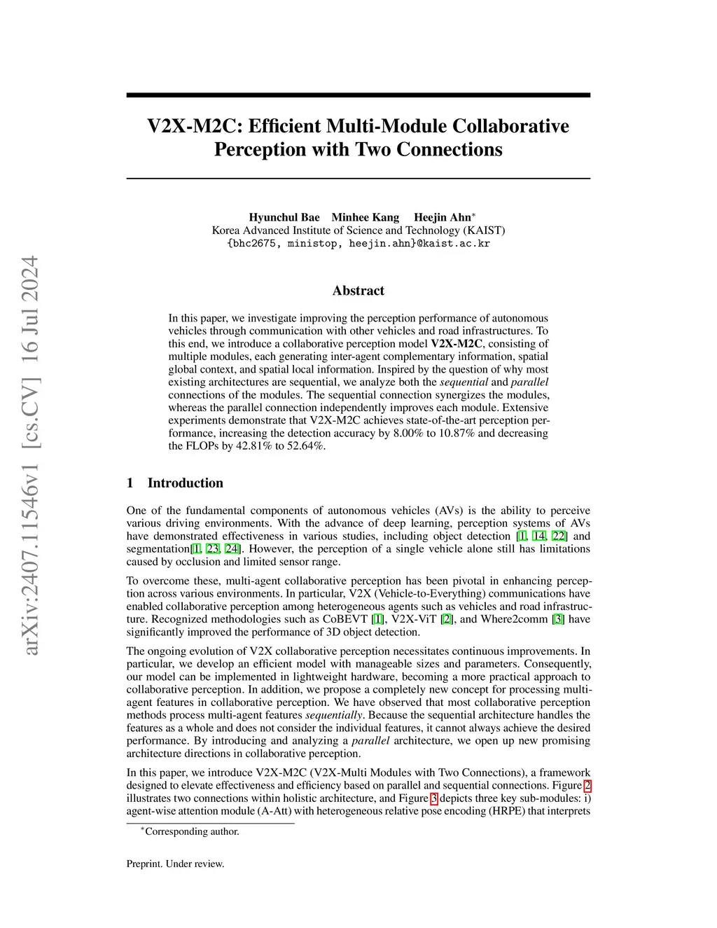 In this paper, we investigate improving the perception performance of autonomous vehicles through communication with other vehicles and road infrastructures. To this end, we introduce a collaborative perception model , consisting of multiple modules, each generating inter-agent complementary information, spatial global context, and spatial local information. Inspired by the question of why most existing architectures are sequential, we analyze both the and connections of the modules. The sequential connection synergizes the modules, whereas the parallel connection independently improves each module. Extensive experiments demonstrate that V2X-M2C achieves state-of-the-art perception performance, increasing the detection accuracy by 8.00% to 10.87% and decreasing the FLOPs by 42.81% to 52.64%.