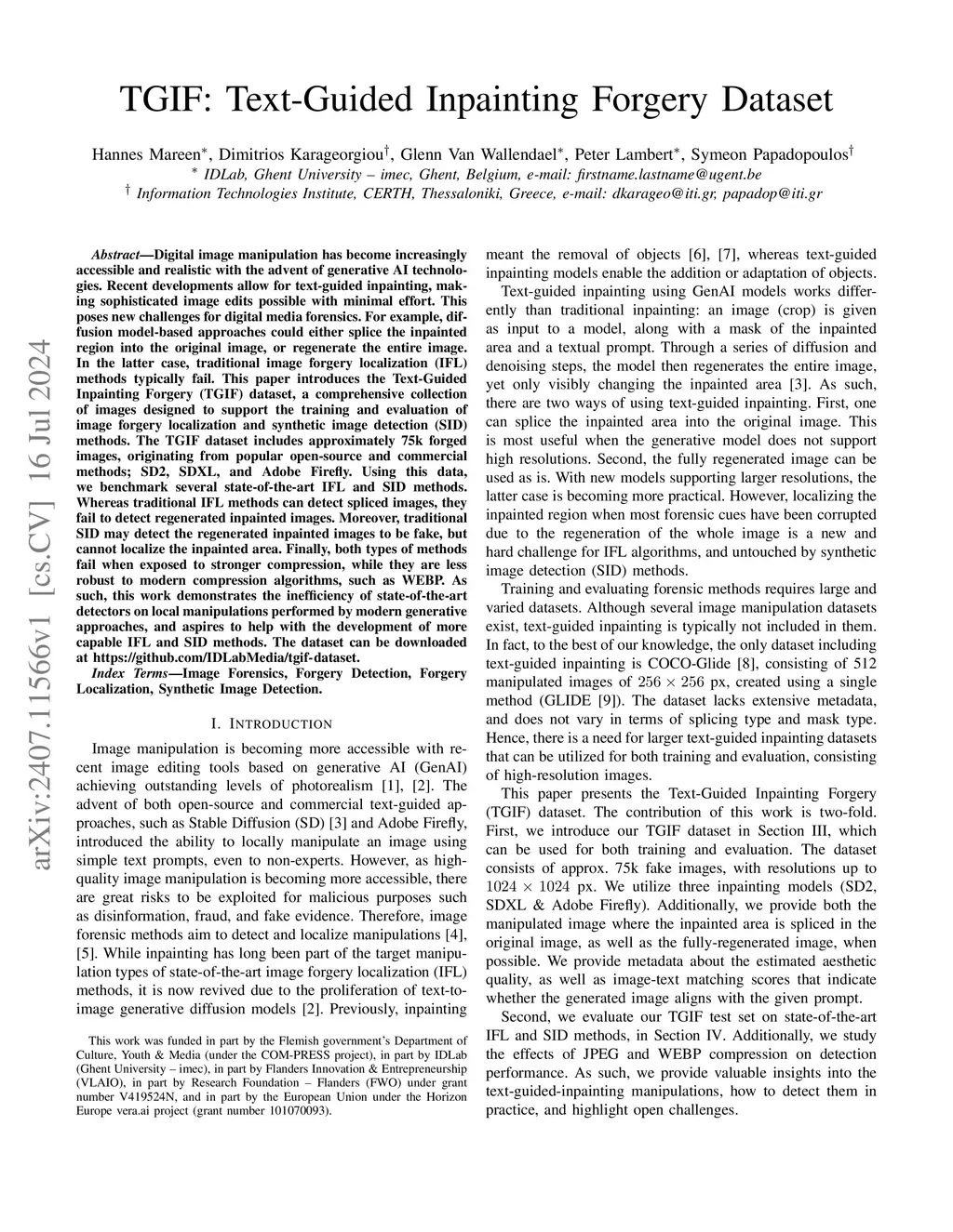 Digital image manipulation has become increasingly accessible and realistic with the advent of generative AI technologies. Recent developments allow for text-guided inpainting, making sophisticated image edits possible with minimal effort. This poses new challenges for digital media forensics. For example, diffusion model-based approaches could either splice the inpainted region into the original image, or regenerate the entire image. In the latter case, traditional image forgery localization (IFL) methods typically fail. This paper introduces the Text-Guided Inpainting Forgery (TGIF) dataset, a comprehensive collection of images designed to support the training and evaluation of image forgery localization and synthetic image detection (SID) methods. The TGIF dataset includes approximately 80k forged images, originating from popular open-source and commercial methods; SD2, SDXL, and Adobe Firefly. Using this data, we benchmark several state-of-the-art IFL and SID methods. Whereas traditional IFL methods can detect spliced images, they fail to detect regenerated inpainted images. Moreover, traditional SID may detect the regenerated inpainted images to be fake, but cannot localize the inpainted area. Finally, both types of methods fail when exposed to stronger compression, while they are less robust to modern compression algorithms, such as WEBP. As such, this work demonstrates the inefficiency of state-of-the-art detectors on local manipulations performed by modern generative approaches, and aspires to help with the development of more capable IFL and SID methods. The dataset can be downloaded at https://github.com/IDLabMedia/tgif-dataset.