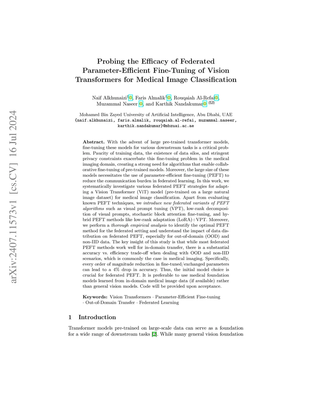 With the advent of large pre-trained transformer models, fine-tuning these models for various downstream tasks is a critical problem. Paucity of training data, the existence of data silos, and stringent privacy constraints exacerbate this fine-tuning problem in the medical imaging domain, creating a strong need for algorithms that enable collaborative fine-tuning of pre-trained models. Moreover, the large size of these models necessitates the use of parameter-efficient fine-tuning (PEFT) to reduce the communication burden in federated learning. In this work, we systematically investigate various federated PEFT strategies for adapting a Vision Transformer (ViT) model (pre-trained on a large natural image dataset) for medical image classification. Apart from evaluating known PEFT techniques, we introduce new federated variants of PEFT algorithms such as visual prompt tuning (VPT), low-rank decomposition of visual prompts, stochastic block attention fine-tuning, and hybrid PEFT methods like low-rank adaptation (LoRA)+VPT. Moreover, we perform a thorough empirical analysis to identify the optimal PEFT method for the federated setting and understand the impact of data distribution on federated PEFT, especially for out-of-domain (OOD) and non-IID data. The key insight of this study is that while most federated PEFT methods work well for in-domain transfer, there is a substantial accuracy vs. efficiency trade-off when dealing with OOD and non-IID scenarios, which is commonly the case in medical imaging. Specifically, every order of magnitude reduction in fine-tuned/exchanged parameters can lead to a 4% drop in accuracy. Thus, the initial model choice is crucial for federated PEFT. It is preferable to use medical foundation models learned from in-domain medical image data (if available) rather than general vision models.