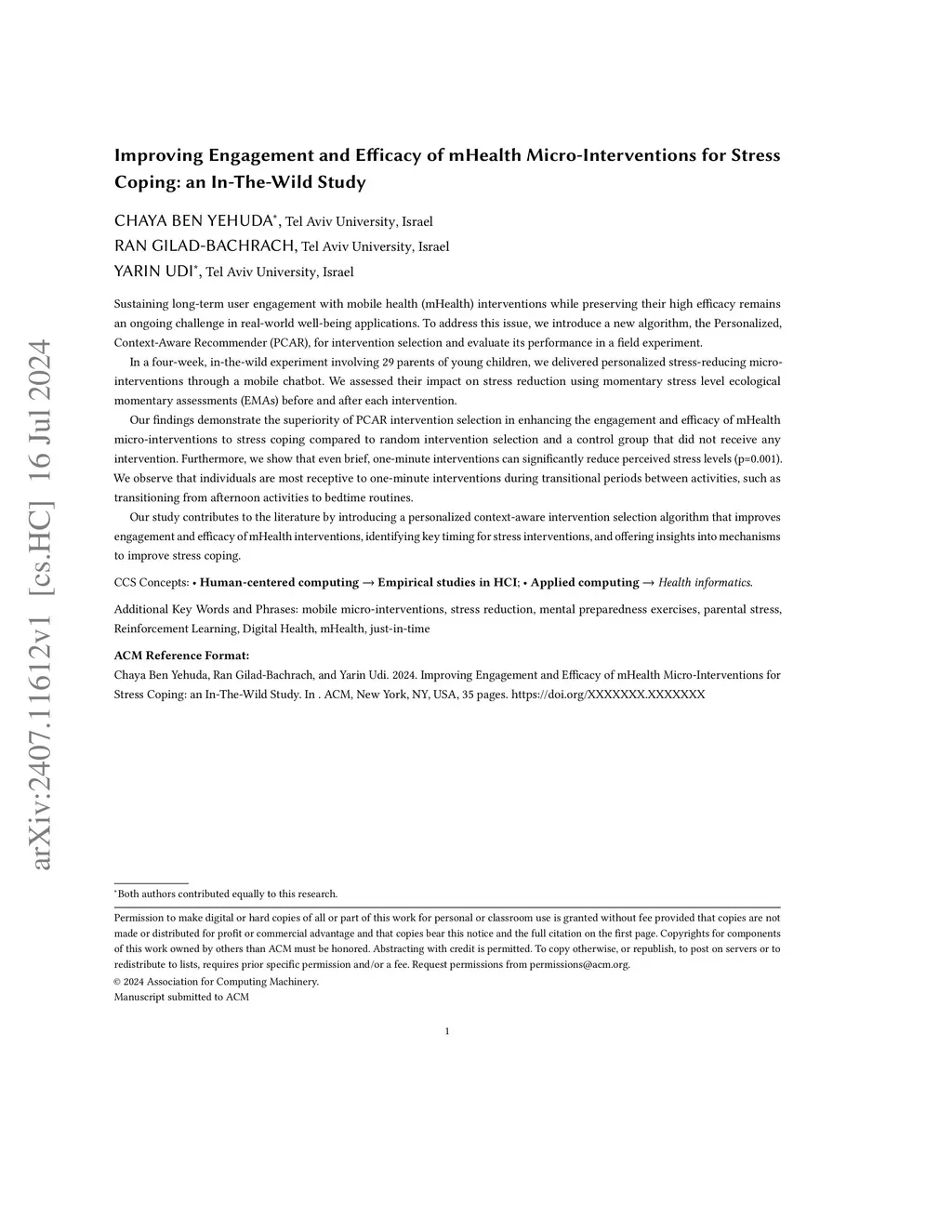 Sustaining long-term user engagement with mobile health (mHealth) interventions while preserving their high efficacy remains an ongoing challenge in real-world well-being applications. To address this issue, we introduce a new algorithm, the Personalized, Context-Aware Recommender (PCAR), for intervention selection and evaluate its performance in a field experiment. In a four-week, in-the-wild experiment involving 29 parents of young children, we delivered personalized stress-reducing micro-interventions through a mobile chatbot. We assessed their impact on stress reduction using momentary stress level ecological momentary assessments (EMAs) before and after each intervention. Our findings demonstrate the superiority of PCAR intervention selection in enhancing the engagement and efficacy of mHealth micro-interventions to stress coping compared to random intervention selection and a control group that did not receive any intervention. Furthermore, we show that even brief, one-minute interventions can significantly reduce perceived stress levels (p=0.001). We observe that individuals are most receptive to one-minute interventions during transitional periods between activities, such as transitioning from afternoon activities to bedtime routines. Our study contributes to the literature by introducing a personalized context-aware intervention selection algorithm that improves engagement and efficacy of mHealth interventions, identifying key timing for stress interventions, and offering insights into mechanisms to improve stress coping.