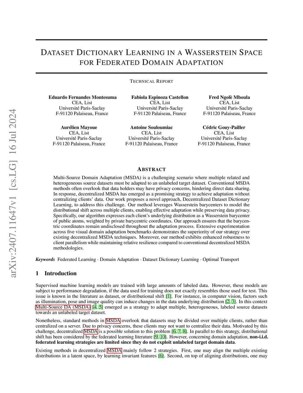 Multi-Source Domain Adaptation (MSDA) is a challenging scenario where multiple related and heterogeneous source datasets must be adapted to an unlabeled target dataset. Conventional MSDA methods often overlook that data holders may have privacy concerns, hindering direct data sharing. In response, decentralized MSDA has emerged as a promising strategy to achieve adaptation without centralizing clients' data. Our work proposes a novel approach, Decentralized Dataset Dictionary Learning, to address this challenge. Our method leverages Wasserstein barycenters to model the distributional shift across multiple clients, enabling effective adaptation while preserving data privacy. Specifically, our algorithm expresses each client's underlying distribution as a Wasserstein barycenter of public atoms, weighted by private barycentric coordinates. Our approach ensures that the barycentric coordinates remain undisclosed throughout the adaptation process. Extensive experimentation across five visual domain adaptation benchmarks demonstrates the superiority of our strategy over existing decentralized MSDA techniques. Moreover, our method exhibits enhanced robustness to client parallelism while maintaining relative resilience compared to conventional decentralized MSDA methodologies.
