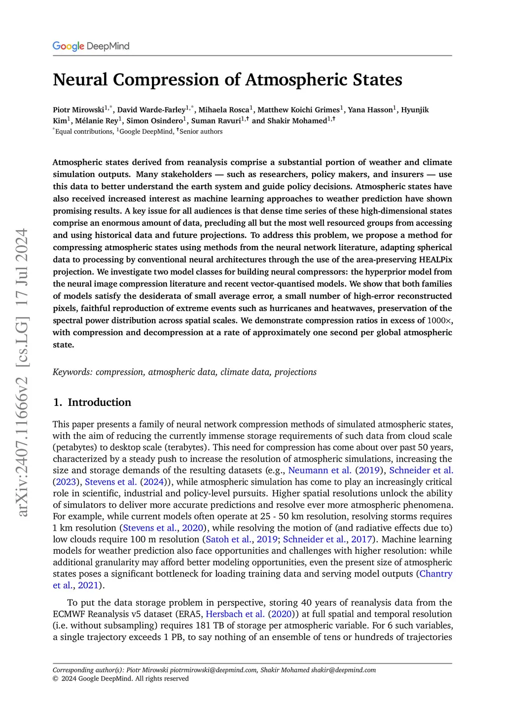 Atmospheric states derived from reanalysis comprise a substantial portion of weather and climate simulation outputs. Many stakeholders -- such as researchers, policy makers, and insurers -- use this data to better understand the earth system and guide policy decisions. Atmospheric states have also received increased interest as machine learning approaches to weather prediction have shown promising results. A key issue for all audiences is that dense time series of these high-dimensional states comprise an enormous amount of data, precluding all but the most well resourced groups from accessing and using historical data and future projections. To address this problem, we propose a method for compressing atmospheric states using methods from the neural network literature, adapting spherical data to processing by conventional neural architectures through the use of the area-preserving HEALPix projection. We investigate two model classes for building neural compressors: the hyperprior model from the neural image compression literature and recent vector-quantised models. We show that both families of models satisfy the desiderata of small average error, a small number of high-error reconstructed pixels, faithful reproduction of extreme events such as hurricanes and heatwaves, preservation of the spectral power distribution across spatial scales. We demonstrate compression ratios in excess of 1000x, with compression and decompression at a rate of approximately one second per global atmospheric state.