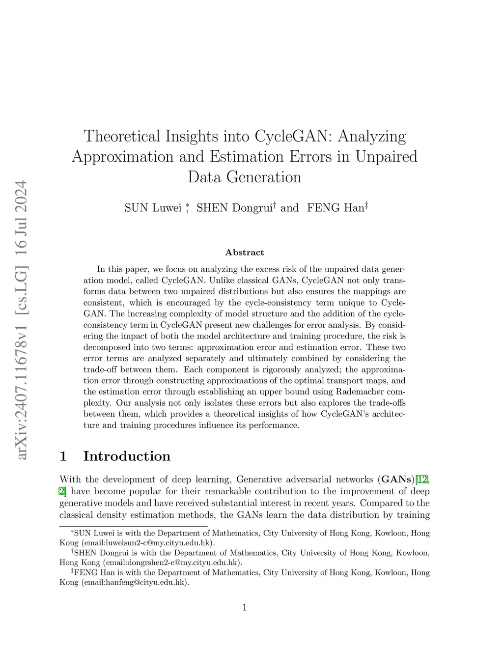 In this paper, we focus on analyzing the excess risk of the unpaired data generation model, called CycleGAN. Unlike classical GANs, CycleGAN not only transforms data between two unpaired distributions but also ensures the mappings are consistent, which is encouraged by the cycle-consistency term unique to CycleGAN. The increasing complexity of model structure and the addition of the cycle-consistency term in CycleGAN present new challenges for error analysis. By considering the impact of both the model architecture and training procedure, the risk is decomposed into two terms: approximation error and estimation error. These two error terms are analyzed separately and ultimately combined by considering the trade-off between them. Each component is rigorously analyzed; the approximation error through constructing approximations of the optimal transport maps, and the estimation error through establishing an upper bound using Rademacher complexity. Our analysis not only isolates these errors but also explores the trade-offs between them, which provides a theoretical insights of how CycleGAN's architecture and training procedures influence its performance.