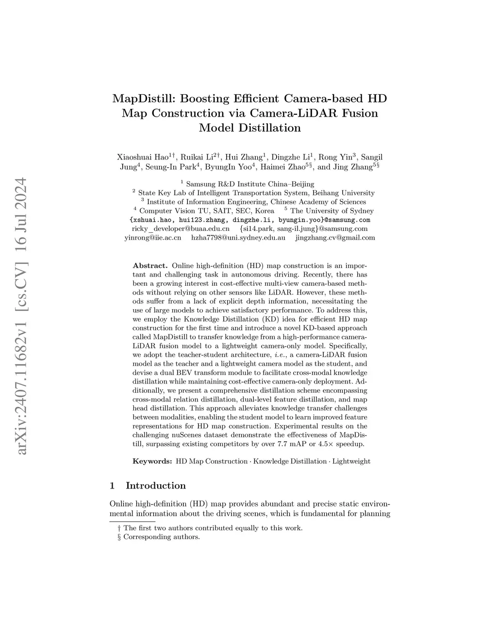 MapDistill: Boosting Efficient Camera-based HD Map Construction via