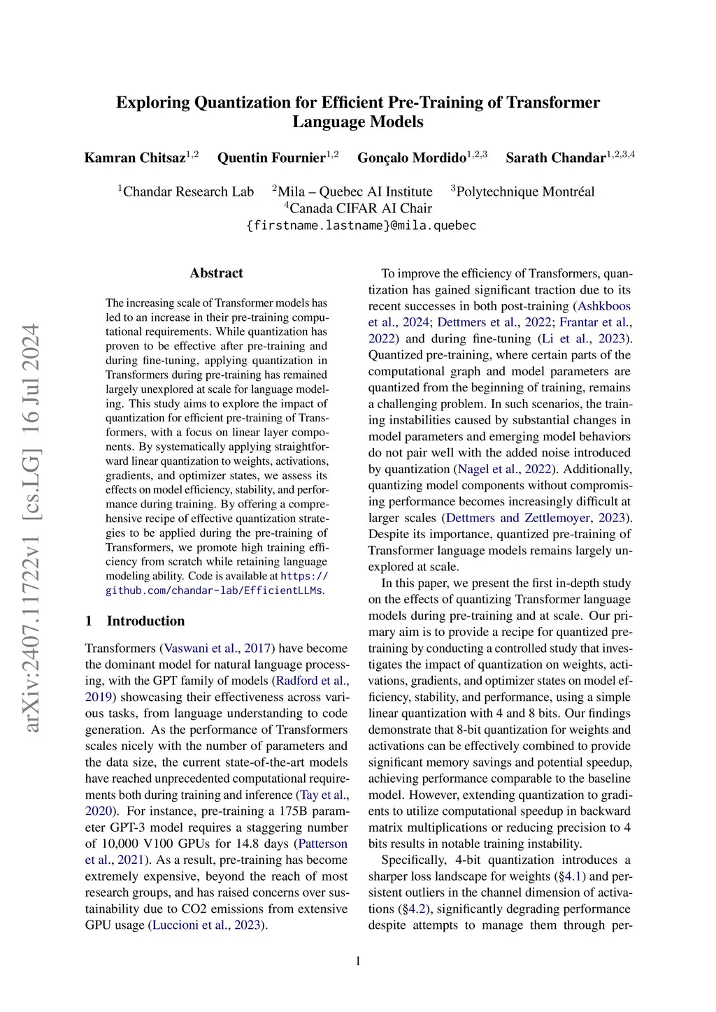 The increasing scale of Transformer models has led to an increase in their pre-training computational requirements. While quantization has proven to be effective after pre-training and during fine-tuning, applying quantization in Transformers during pre-training has remained largely unexplored at scale for language modeling. This study aims to explore the impact of quantization for efficient pre-training of Transformers, with a focus on linear layer components. By systematically applying straightforward linear quantization to weights, activations, gradients, and optimizer states, we assess its effects on model efficiency, stability, and performance during training. By offering a comprehensive recipe of effective quantization strategies to be applied during the pre-training of Transformers, we promote high training efficiency from scratch while retaining language modeling ability. Code is available at https://github.com/chandar-lab/EfficientLLMs.