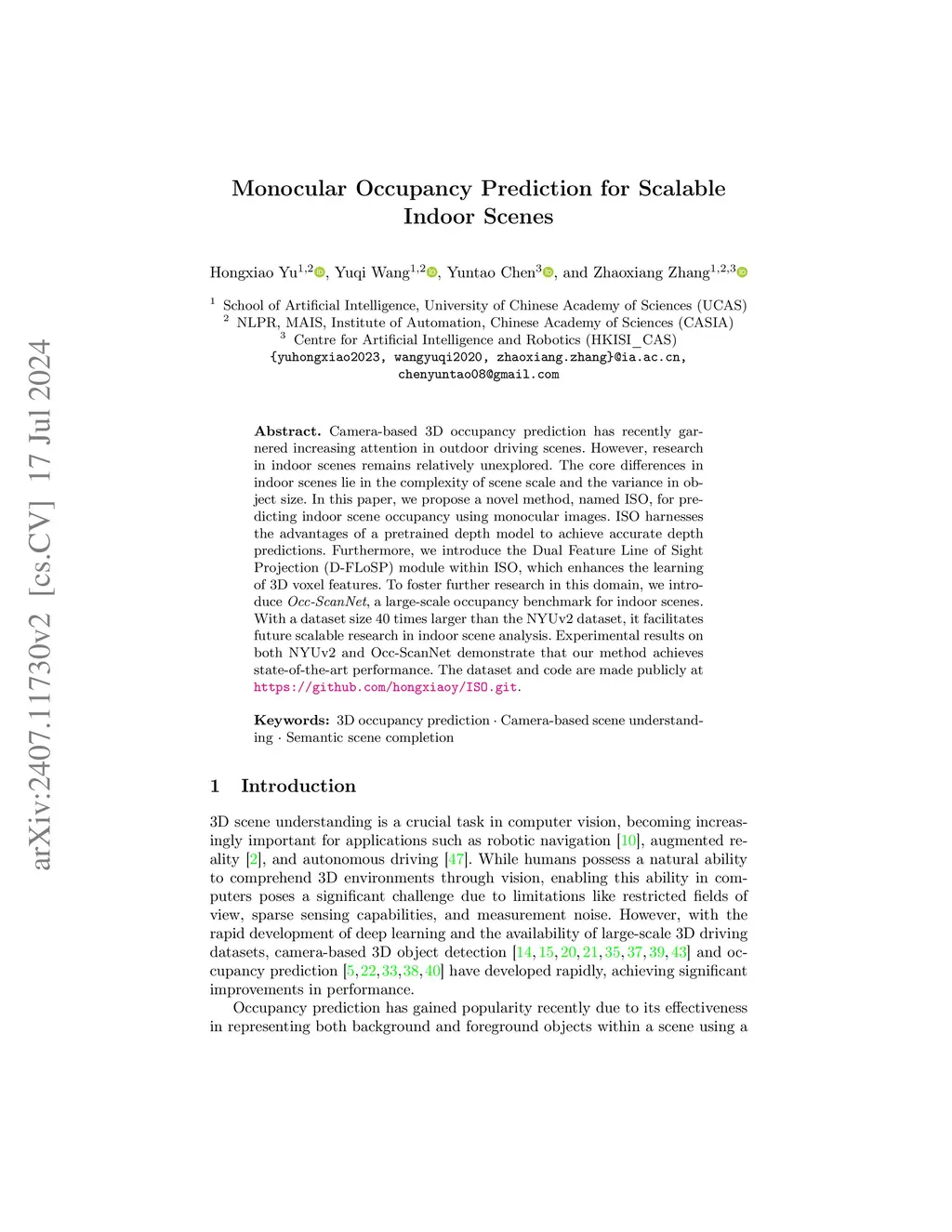 Camera-based 3D occupancy prediction has recently garnered increasing attention in outdoor driving scenes. However, research in indoor scenes remains relatively unexplored. The core differences in indoor scenes lie in the complexity of scene scale and the variance in object size. In this paper, we propose a novel method, named ISO, for predicting indoor scene occupancy using monocular images. ISO harnesses the advantages of a pretrained depth model to achieve accurate depth predictions. Furthermore, we introduce the Dual Feature Line of Sight Projection (D-FLoSP) module within ISO, which enhances the learning of 3D voxel features. To foster further research in this domain, we introduce Occ-ScanNet, a large-scale occupancy benchmark for indoor scenes. With a dataset size 40 times larger than the NYUv2 dataset, it facilitates future scalable research in indoor scene analysis. Experimental results on both NYUv2 and Occ-ScanNet demonstrate that our method achieves state-of-the-art performance. The dataset and code are made publicly at https://github.com/hongxiaoy/ISO.git.