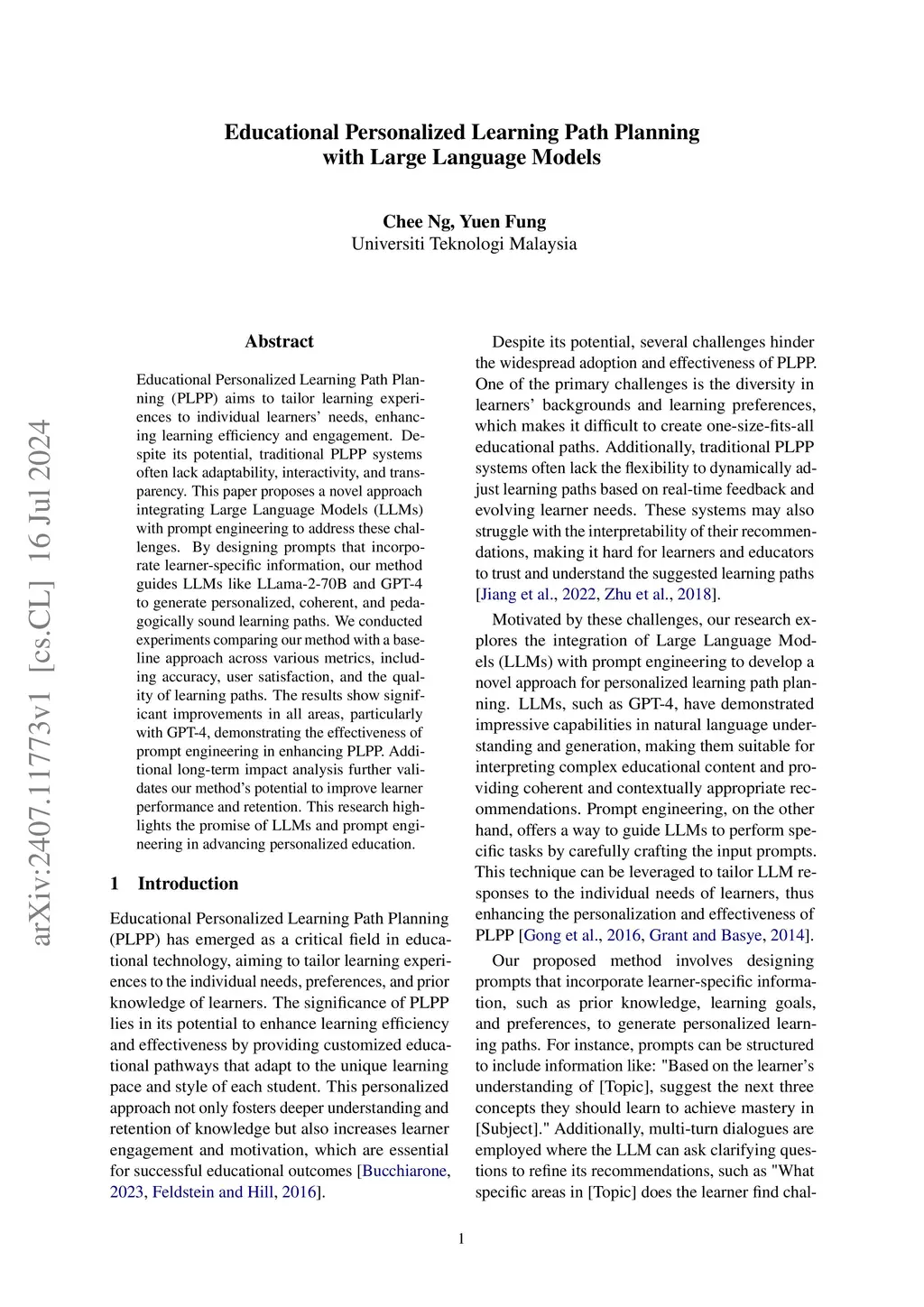 Educational Personalized Learning Path Planning (PLPP) aims to tailor learning experiences to individual learners' needs, enhancing learning efficiency and engagement. Despite its potential, traditional PLPP systems often lack adaptability, interactivity, and transparency. This paper proposes a novel approach integrating Large Language Models (LLMs) with prompt engineering to address these challenges. By designing prompts that incorporate learner-specific information, our method guides LLMs like LLama-2-70B and GPT-4 to generate personalized, coherent, and pedagogically sound learning paths. We conducted experiments comparing our method with a baseline approach across various metrics, including accuracy, user satisfaction, and the quality of learning paths. The results show significant improvements in all areas, particularly with GPT-4, demonstrating the effectiveness of prompt engineering in enhancing PLPP. Additional long-term impact analysis further validates our method's potential to improve learner performance and retention. This research highlights the promise of LLMs and prompt engineering in advancing personalized education.