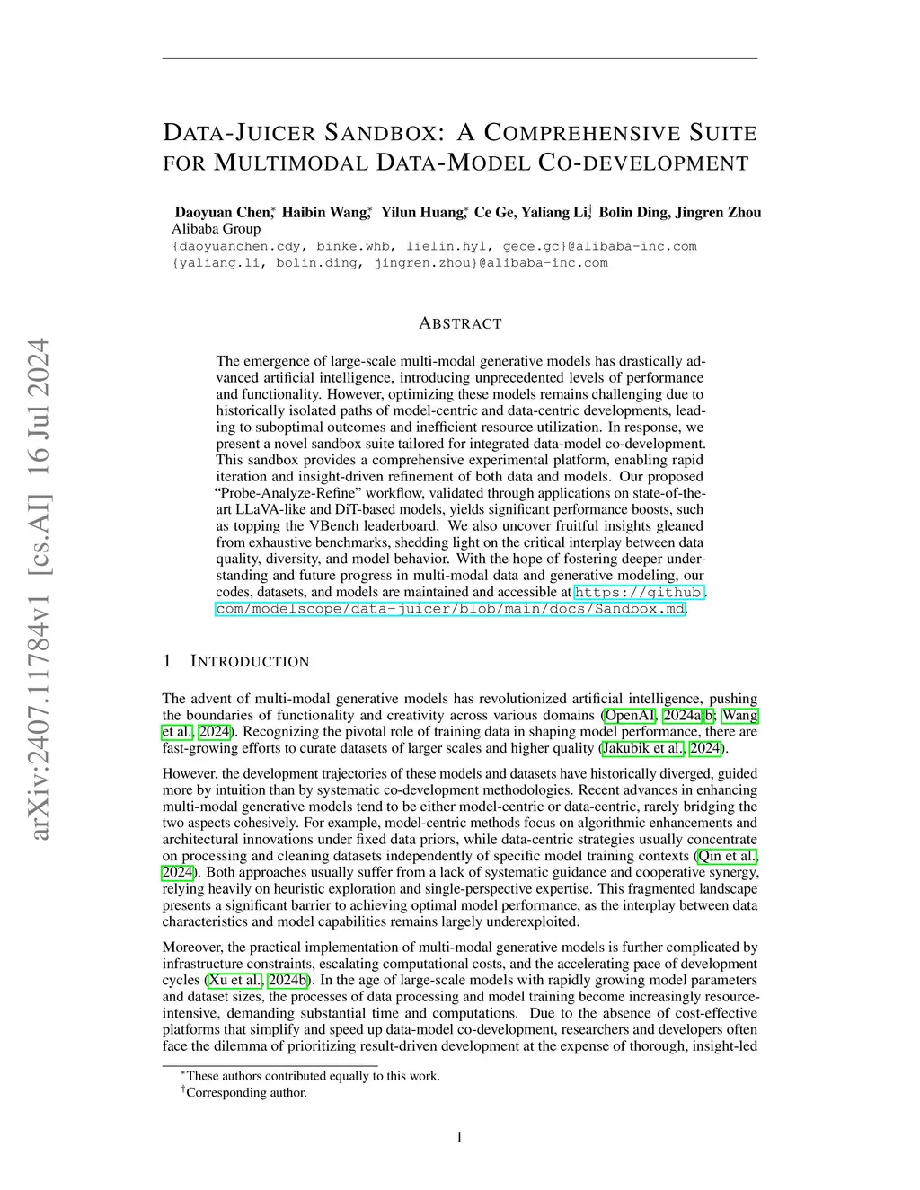 The emergence of multimodal large models has advanced artificial intelligence, introducing unprecedented levels of performance and functionality. However, optimizing these models remains challenging due to historically isolated paths of model-centric and data-centric developments, leading to suboptimal outcomes and inefficient resource utilization. In response, we present a new sandbox suite tailored for integrated data-model co-development. This sandbox provides a feedback-driven experimental platform, enabling cost-effective iteration and guided refinement of both data and models. Our proposed ``Probe-Analyze-Refine'' workflow, validated through practical use cases on multimodal tasks such as image-text pre-training with CLIP, image-to-text generation with LLaVA-like models, and text-to-video generation with DiT-based models, yields transferable and notable performance boosts, such as topping the VBench leaderboard. A comprehensive set of over 100 experiments demonstrated the suite's usability and extensibility, while also uncovering insights into the interplay between data quality, diversity, model behavior, and computational costs. All codes, datasets, and models are open-sourced to foster future research and applications that would otherwise be infeasible due to the lack of a dedicated co-development infrastructure.
