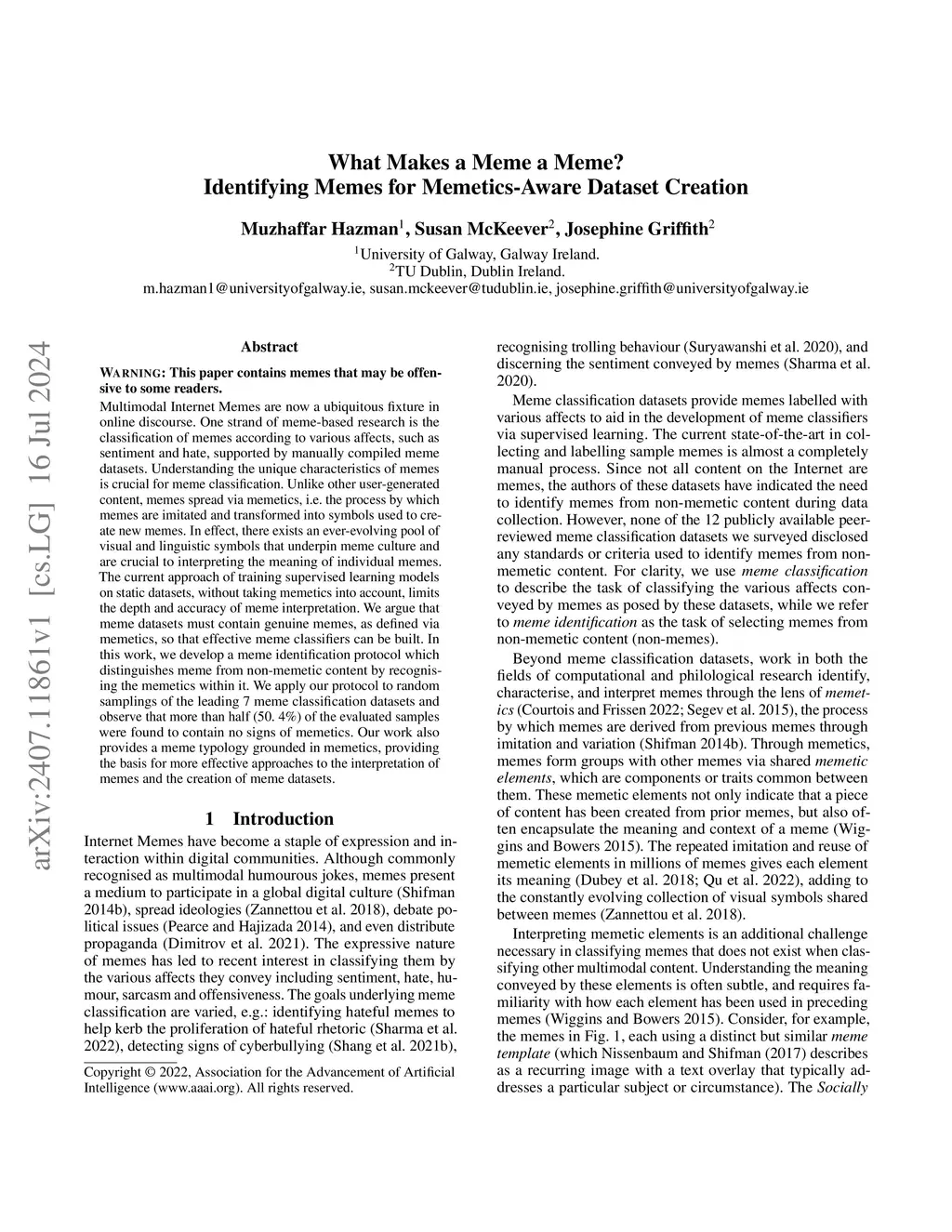 Warning: This paper contains memes that may be offensive to some readers. Multimodal Internet Memes are now a ubiquitous fixture in online discourse. One strand of meme-based research is the classification of memes according to various affects, such as sentiment and hate, supported by manually compiled meme datasets. Understanding the unique characteristics of memes is crucial for meme classification. Unlike other user-generated content, memes spread via memetics, i.e. the process by which memes are imitated and transformed into symbols used to create new memes. In effect, there exists an ever-evolving pool of visual and linguistic symbols that underpin meme culture and are crucial to interpreting the meaning of individual memes. The current approach of training supervised learning models on static datasets, without taking memetics into account, limits the depth and accuracy of meme interpretation. We argue that meme datasets must contain genuine memes, as defined via memetics, so that effective meme classifiers can be built. In this work, we develop a meme identification protocol which distinguishes meme from non-memetic content by recognising the memetics within it. We apply our protocol to random samplings of the leading 7 meme classification datasets and observe that more than half (50. 4\%) of the evaluated samples were found to contain no signs of memetics. Our work also provides a meme typology grounded in memetics, providing the basis for more effective approaches to the interpretation of memes and the creation of meme datasets.
