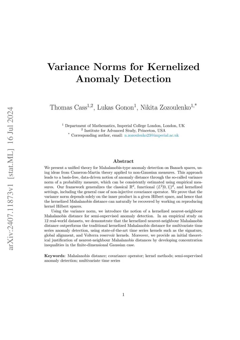 The Mahalanobis distance is a classical tool used to measure the covariance-adjusted distance between points in . In this work, we extend the concept of Mahalanobis distance to separable Banach spaces by reinterpreting it as a Cameron-Martin norm associated with a probability measure. This approach leads to a basis-free, data-driven notion of anomaly distance through the so-called variance norm, which can naturally be estimated using empirical measures of a sample. Our framework generalizes the classical , functional , and kernelized settings; importantly, it incorporates non-injective covariance operators. We prove that the variance norm is invariant under invertible bounded linear transformations of the data, extending previous results which are limited to unitary operators. In the Hilbert space setting, we connect the variance norm to the RKHS of the covariance operator, and establish consistency and convergence results for estimation using empirical measures with Tikhonov regularization. Using the variance norm, we introduce the notion of a kernelized nearest-neighbour Mahalanobis distance, and study some of its finite-sample concentration properties. In an empirical study on 12 real-world data sets, we demonstrate that the kernelized nearest-neighbour Mahalanobis distance outperforms the traditional kernelized Mahalanobis distance for multivariate time series novelty detection, using state-of-the-art time series kernels such as the signature, global alignment, and Volterra reservoir kernels.